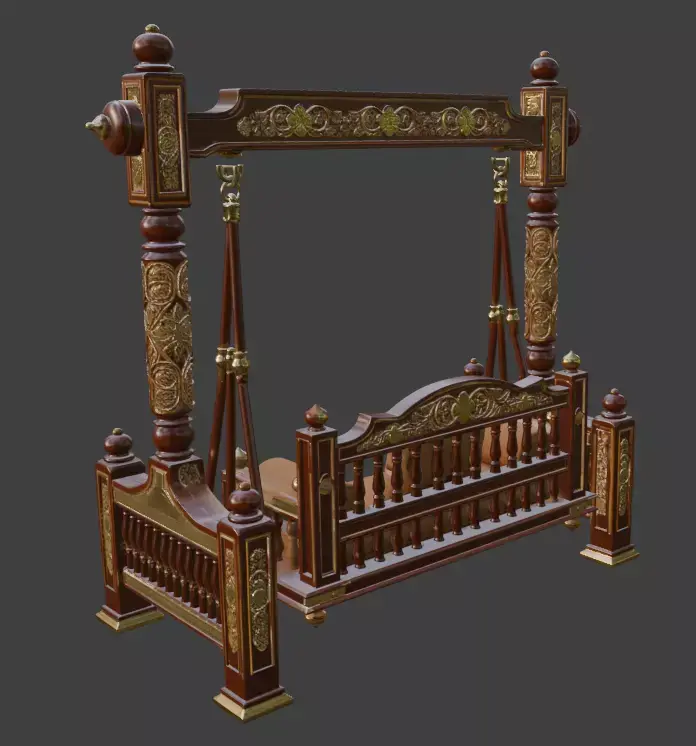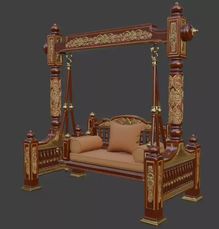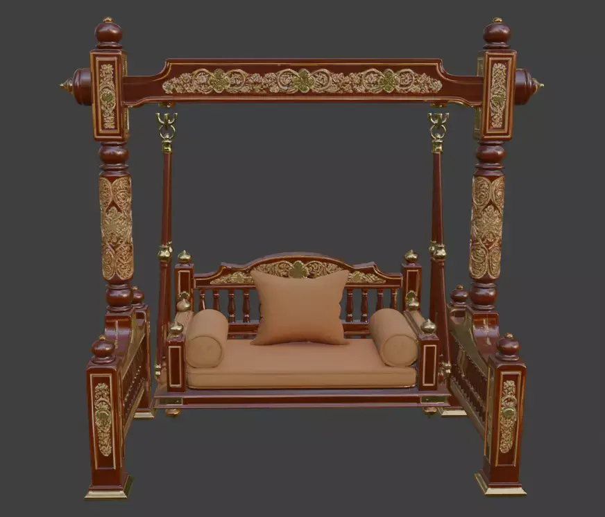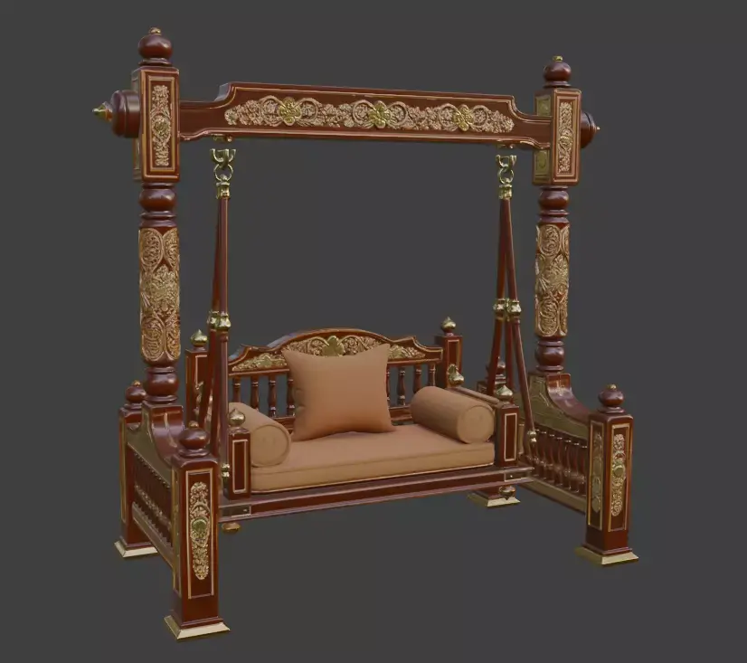 Elevate your interior with this exquisite traditional Indian wooden swing (jhula), meticulously crafted in a rich teak-inspired finish with intricate carvings and royal detailing. Perfect for living rooms, patios, or luxury home decor, this ornate swing features a beautifully sculpted frame with turned pillars, decorative finials, and a plush cushioned seat adorned with elegant patterned fabric and bolsters. The timeless design captures the essence of Indian palace architecture, making it an eye-catching statement piece for any sophisticated space. Ideal for photography, architectural visualization, or high-end residential projects. High-poly 3D model with detailed textures, ready for rendering in any professional software.