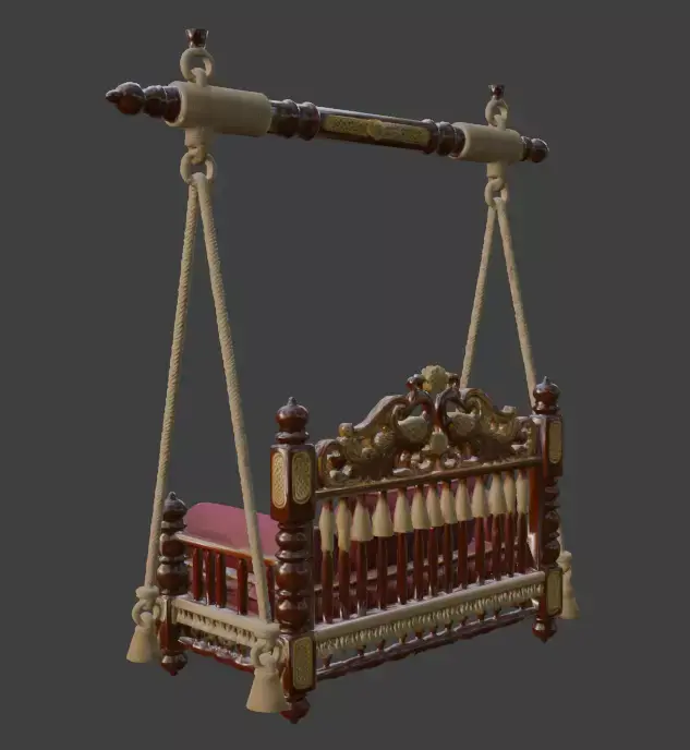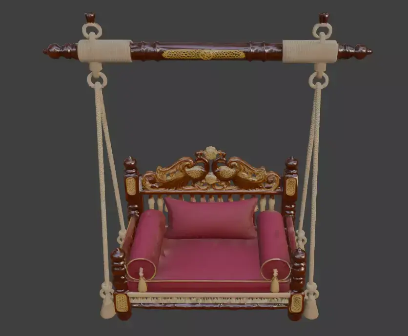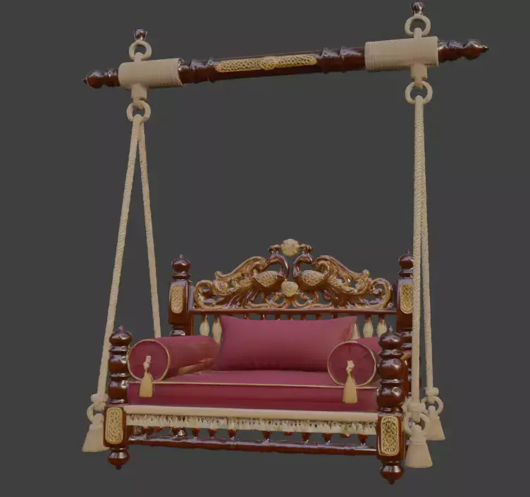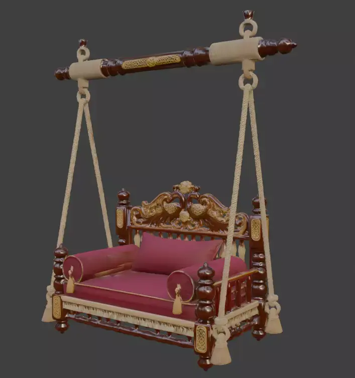 Elevate your interior with this exquisite traditional Indian wooden swing (jhula), meticulously crafted in a rich teak-inspired finish with intricate carvings and royal detailing. Perfect for living rooms, patios, or luxury home decor, this ornate swing features a beautifully sculpted frame with turned pillars, decorative finials, and a plush cushioned seat adorned with elegant patterned fabric and bolsters. The timeless design captures the essence of Indian palace architecture, making it an eye-catching statement piece for any sophisticated space. Ideal for photography, architectural visualization, or high-end residential projects. High-poly 3D model with detailed textures, ready for rendering in any professional software.