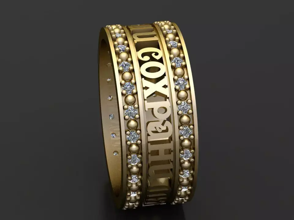 This Royal Script Eternity Ring is a luxurious 3D printable jewelry model featuring a bold openwork text band framed by two rows of raised beads and sparkling gemstones. With its elegant cut-out lettering and premium detailing, this ring is ideal for gold, silver, or platinum casting and makes a powerful statement piece for both men and women.