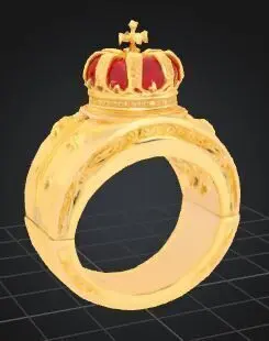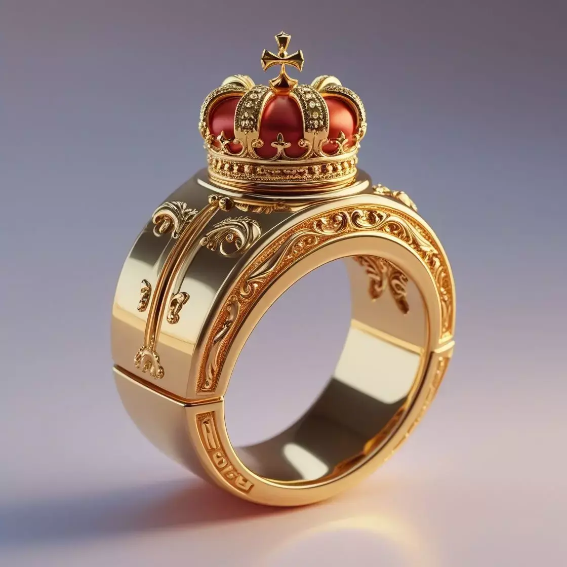 The centerpiece, a rich crimson crown adorned with shimmering jewels, rests atop a perfectly sculpted gold band. The ring’s exquisite detailing and elegant design make it an ideal choice for those seeking a unique, high-end accessory that commands attention.