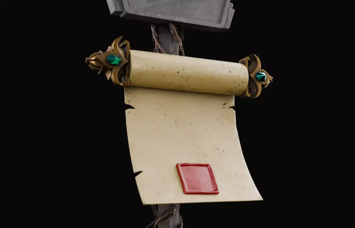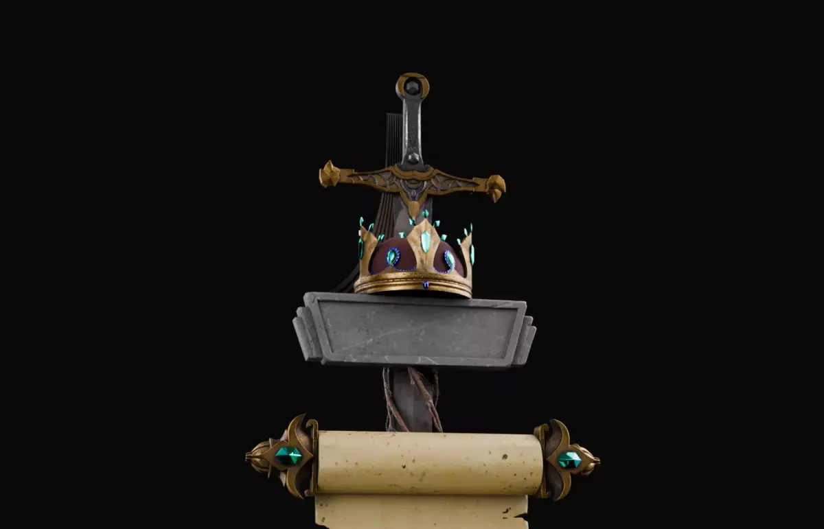 This high poly medieval fantasy prop features a detailed sword, crown, and two scrolls combined into one royal composition. It is designed for use in cinematic renders, concept art, and animation scenes.