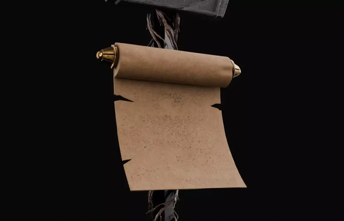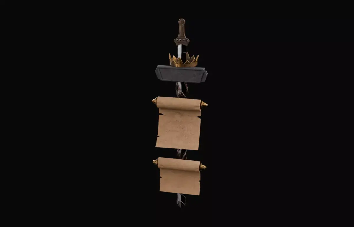 This high poly medieval fantasy prop features a detailed sword, crown, and two scrolls combined into one royal composition. It is designed for use in cinematic renders, concept art, and animation scenes.