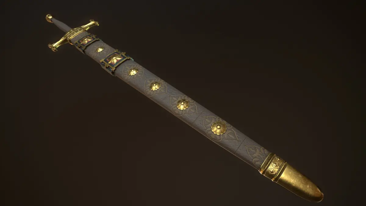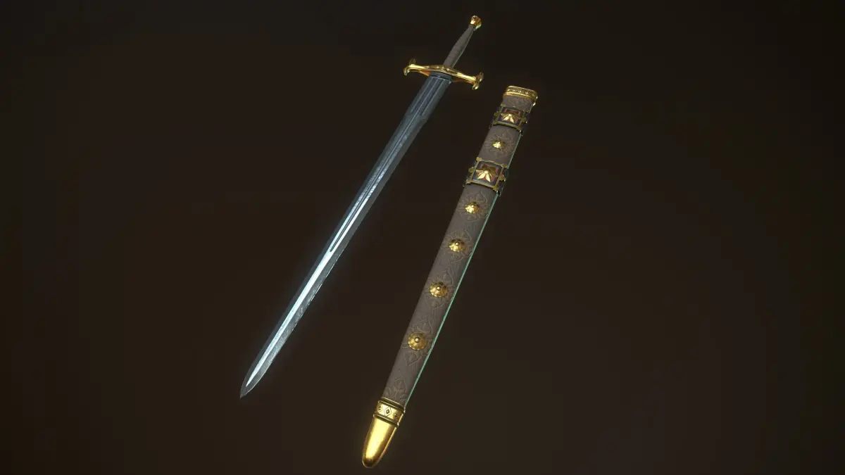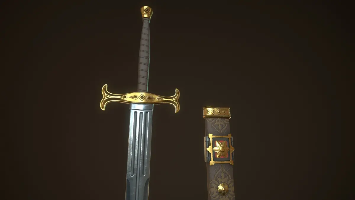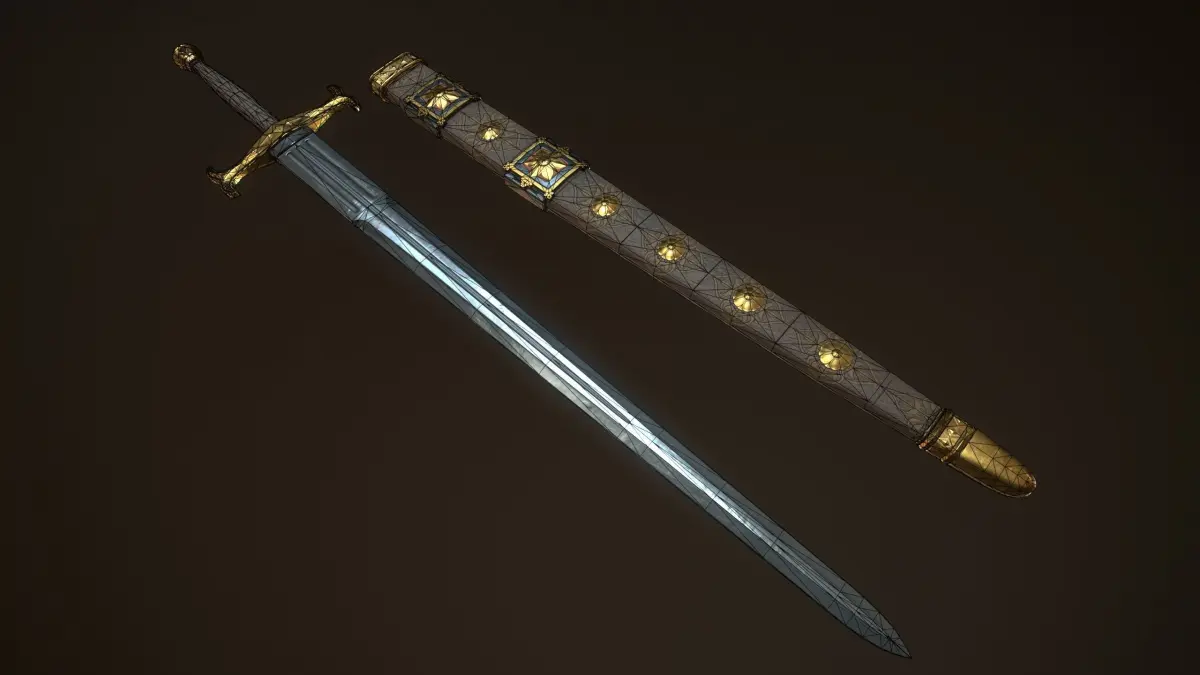 Model of royal sword with scabbard low poly realtime.Polycount total (sword and scabbard) : 4829Textured using PBR metallic.Formats:FBX, Max File(3DSMax 2019), Marmoset Toolbag 4 file (.tbscene)