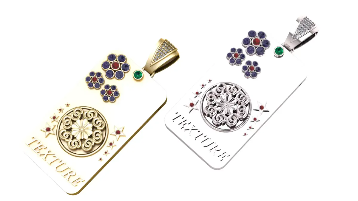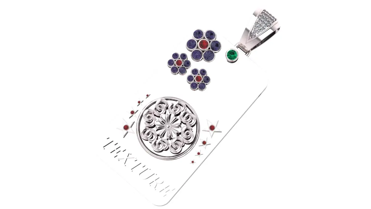 A bold rectangular gold pendant featuring intricate floral patterns, gemstone clusters, and star motifs. Accented with deep purple, red, and green gemstones, the design blends classic ornamentation with modern style. The engraved word “TEXTURE” adds a unique identity, making this pendant stand out as both a fashion statement and an artistic piece.