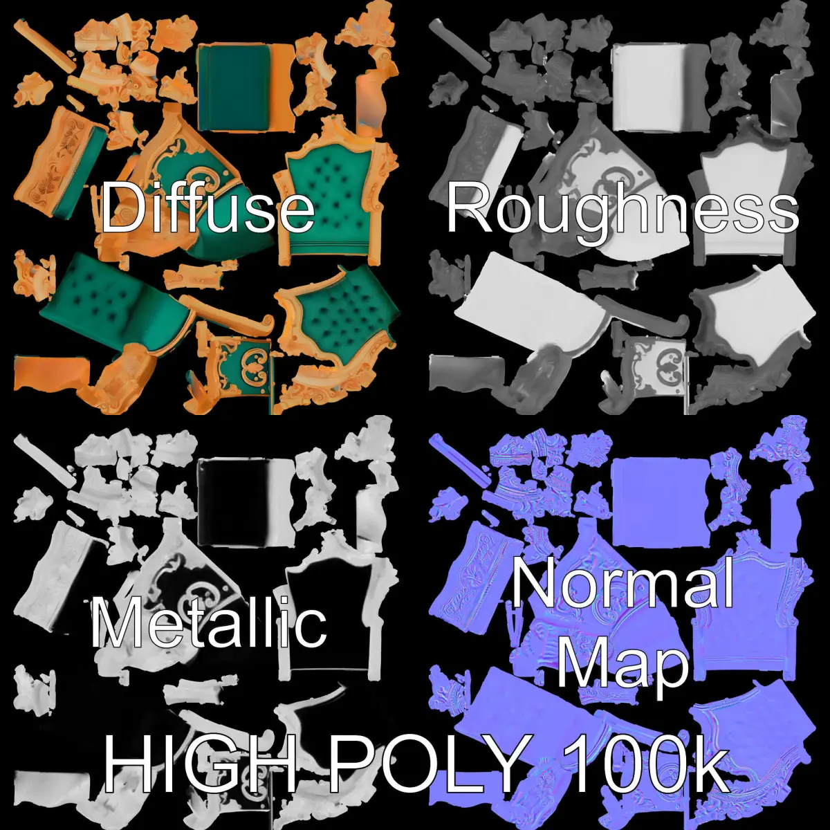 This Royal Throne Chair Model Pack includes three levels of detail: low-poly, mid-poly, and high-poly, perfect for a variety of uses. Its elegant design makes it suitable for historical or fantasy themed environments, such as palaces, medieval castles, or regal interiors in games and animations.