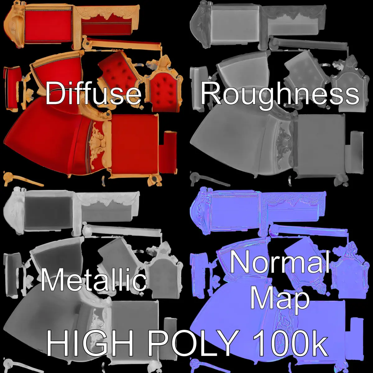 This majestic Royal Throne Chair model pack is designed with three levels of detail—1000 triangles for mobile, 10,000 for environments, and 100,000 for high-quality rendering. Ideal for use in movies, video games, and VR experiences, this throne offers a luxurious regal feel with intricate designs and rich textures. The model's PBR textures include Diffuse, NormalMap, reflection/roughness/metallic, all at a resolution of 4096x4096, compatible with modern rendering engines like 3ds Max, Maya, Blender, and more. All UVs are accurately unwrapped with no overlaps.