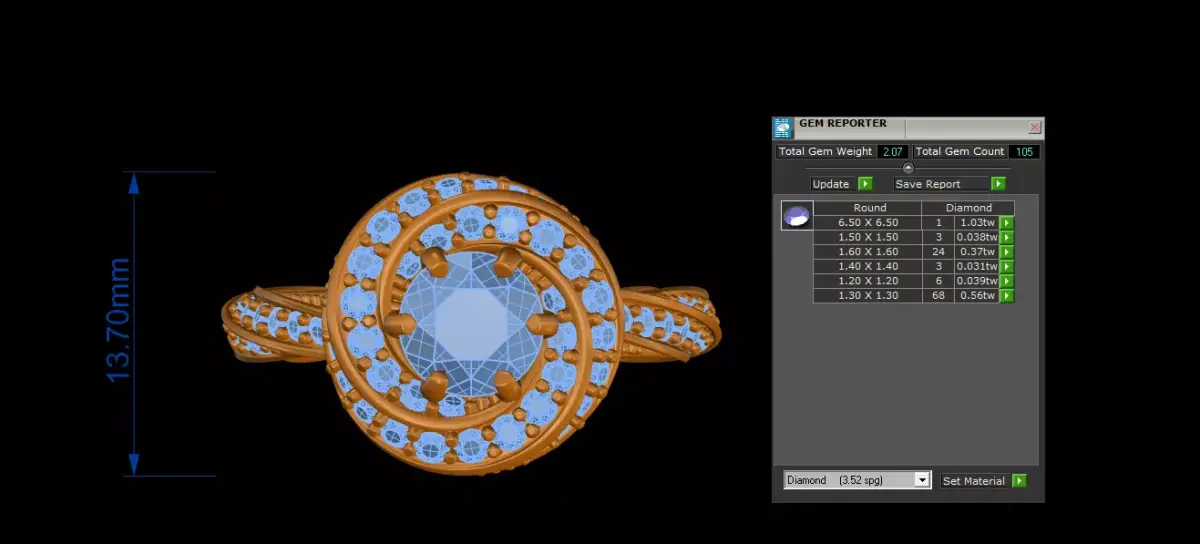 - Stones: Central brilliant-cut diamond with a pavé diamond halo and band.