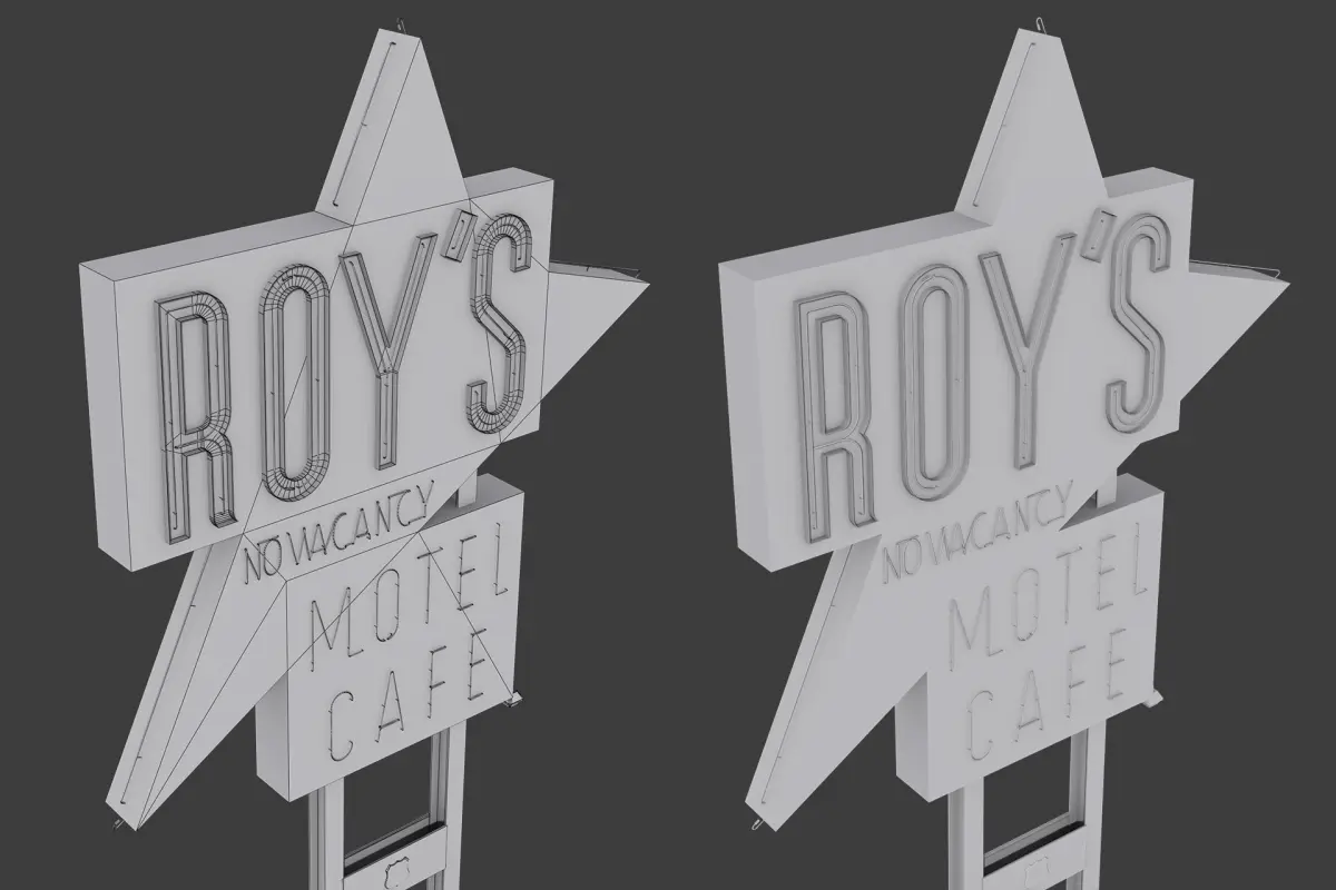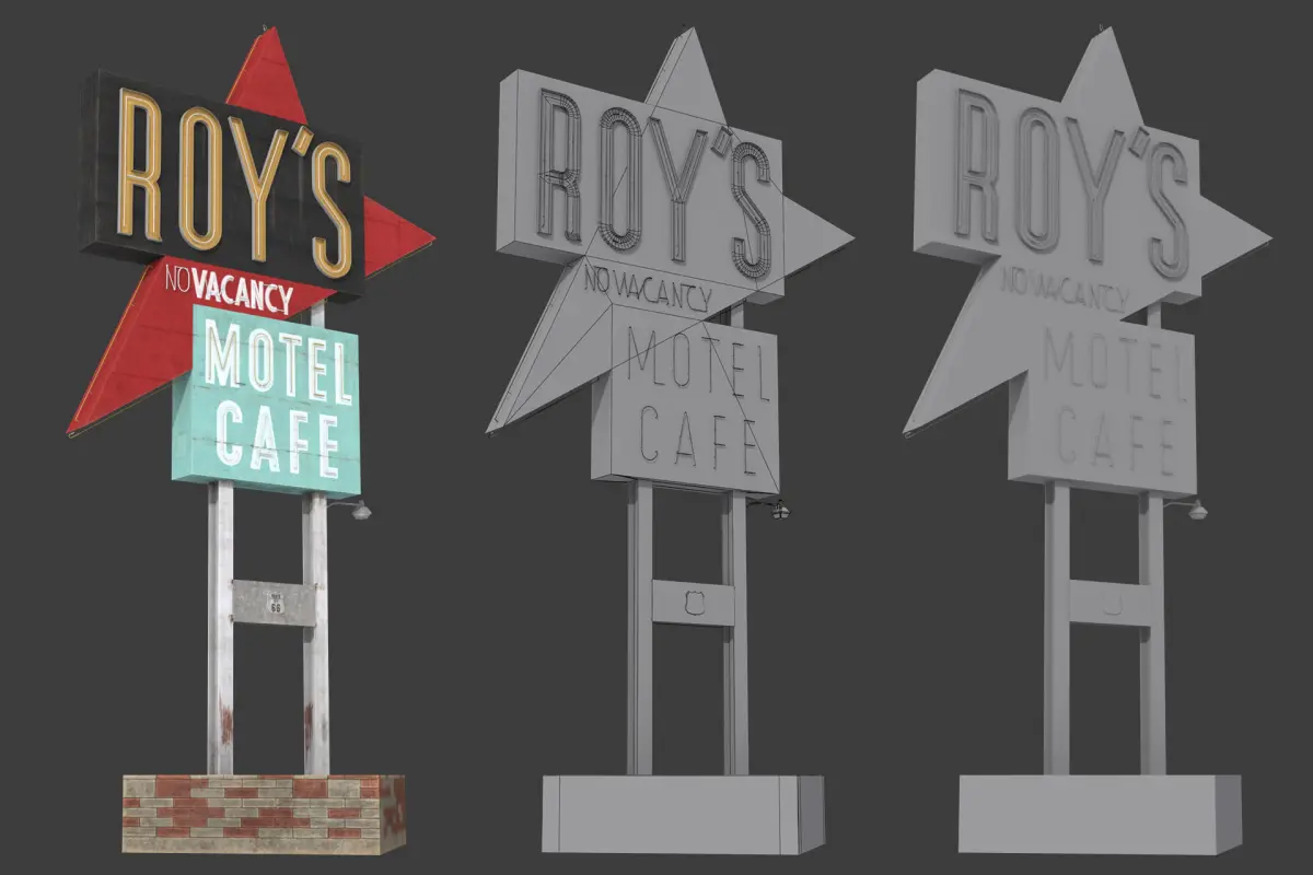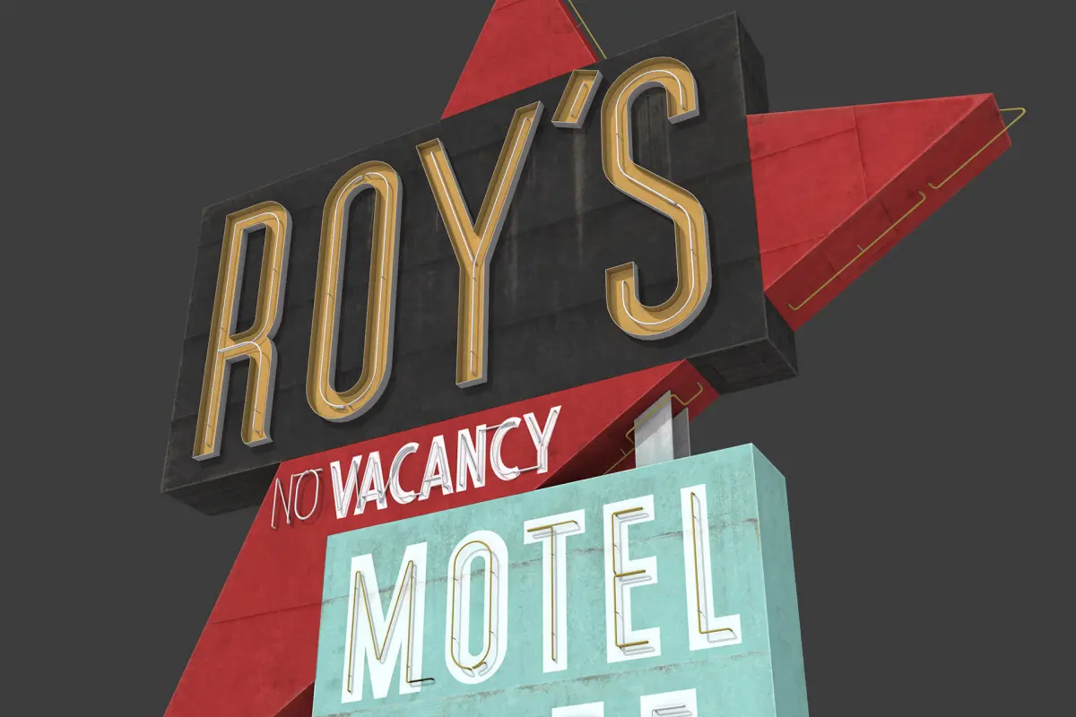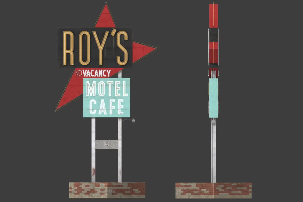 Roy’s Motel Cafe Sign low-poly 3d model ready for Virtual Reality (VR), Augmented Reality (AR), games and other real-time apps.