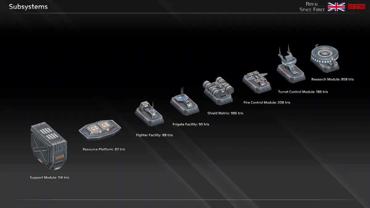 This pack contains the Ark Royal class carrier of the Royal Space Force with modular weapons. It can be used in a space themed game.
