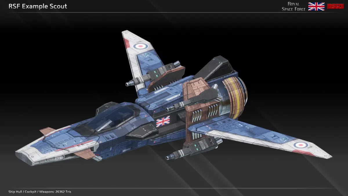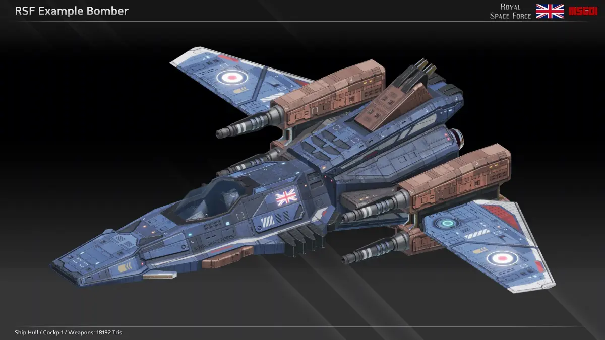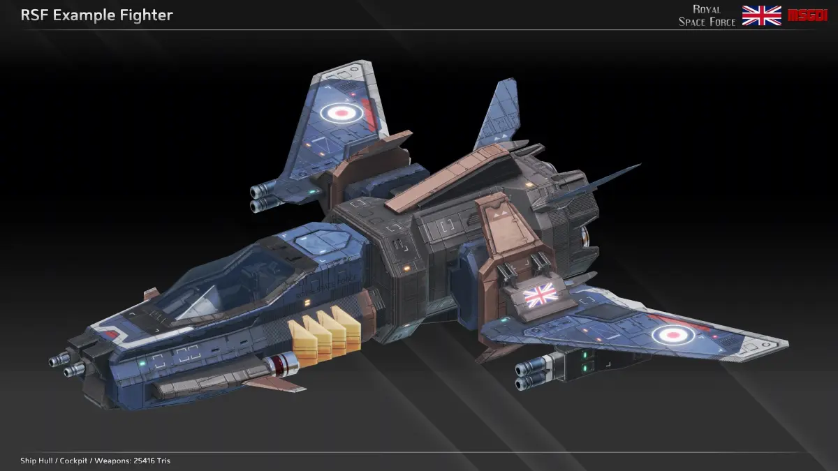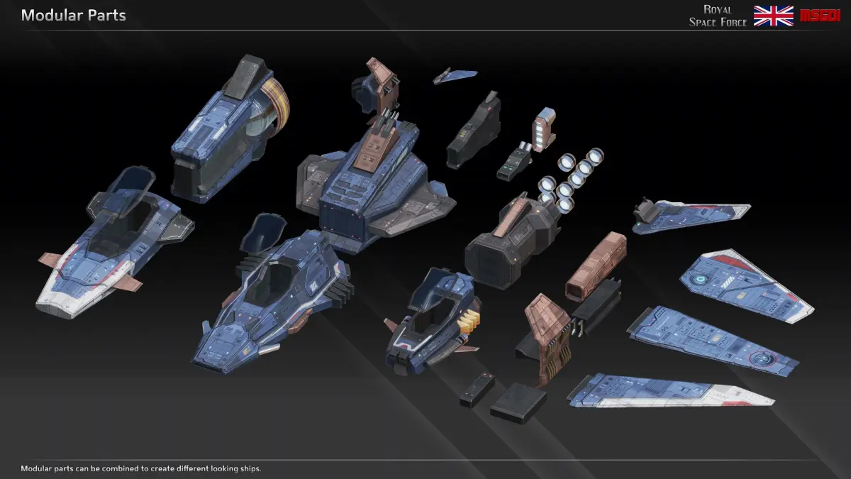 This pack contains the modular scifi fighter kit of the Royal Space Force with modular weapons. It can be used in a space themed game.