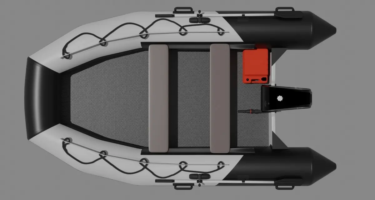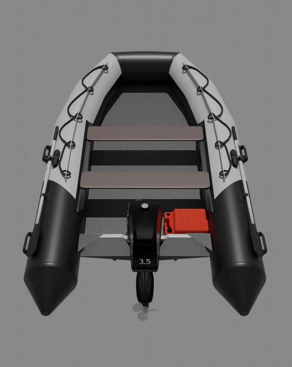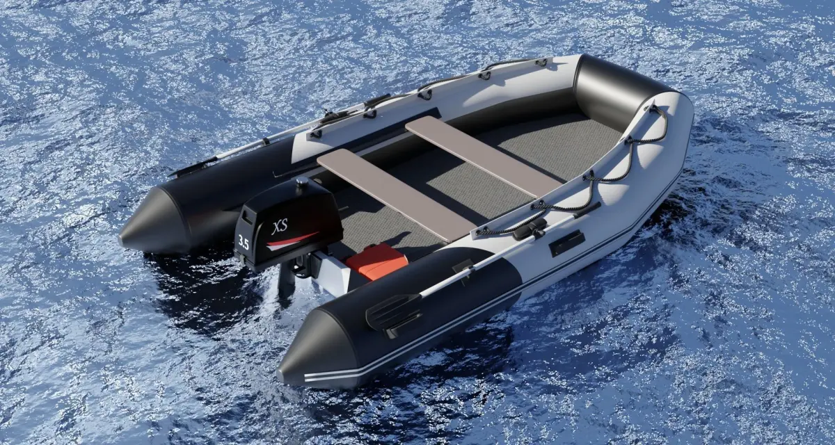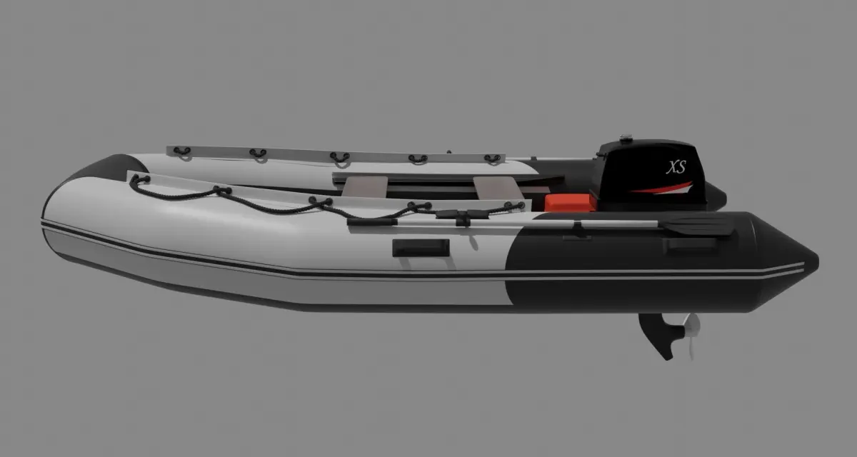 Detailed model of a rubber boat, the outboard motor and a fuel can is included.