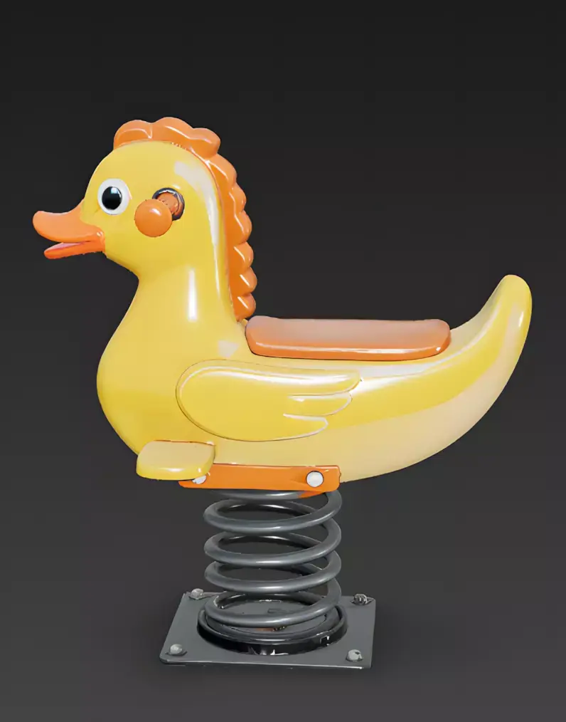 The Overall Concept This asset is a high-quality 3D representation of a classic playground spring rider. It features a playful, stylized duck character designed for child-centric environments or casual game levels. The model emphasizes safety and fun with rounded edges and high-visibility colors.