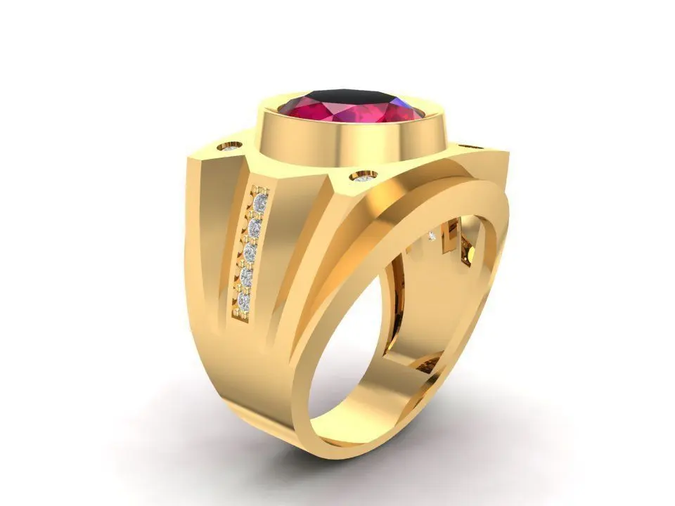 This 3D model showcases a bold men's ring featuring a large oval ruby gemstone as the center stone, accented with small side diamonds for added brilliance. The design is powerful and stylish, with a wide shank and carved details that emphasize masculine elegance. The CAD file includes precise measurements, gemstone sizes, and weight specifications, making it fully ready for 3D printing, CNC manufacturing, and jewelry production. Perfect for jewelers and designers creating luxurious men’s jewelry collections.