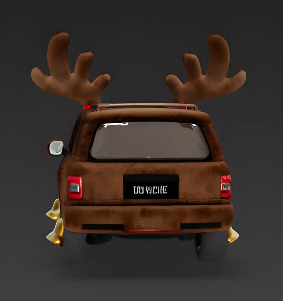 Plush Antlers & Tail Two large, soft antlers are mounted securely to the roof rack, standing tall above the car. If you look closely at the back, there is even a small, fluffy white tail attached to the rear hatch.
