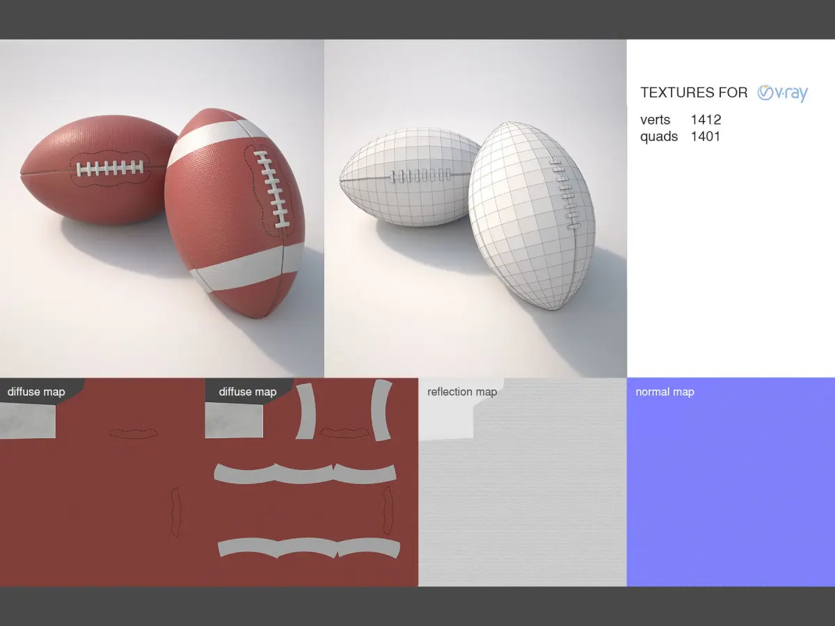 you get 2 rugbies with PBR flattened textures for VRay Standard Material (VRayMtl) for 3ds max and maya.