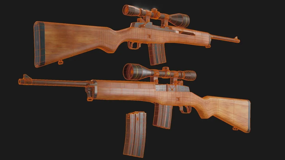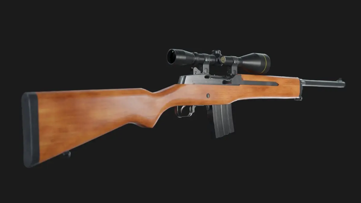 Ruger Mini-14 Ranch Rifle in all traditional wooden stock furniture and heatshield. It has been fitted with a rubber stock pad, Leupold VX-1 Telescopic sight, 20 round magazine and chambered in .223 Remington. This rifle has been textured and marked as close to the real life firearm as possible, however proportions may be a bit off in some areas.