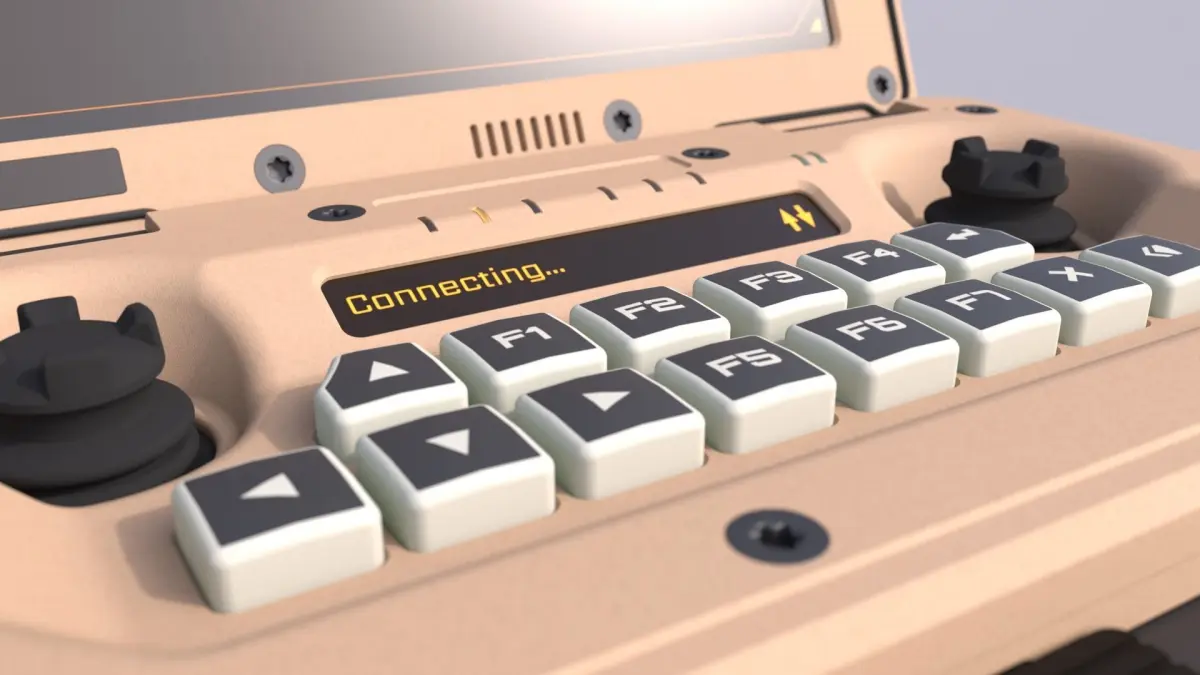 Hi poly 3D model of a generic rugged portable remote controller with integrated foldable screen. Used to guide various drones or other unmanned systems.