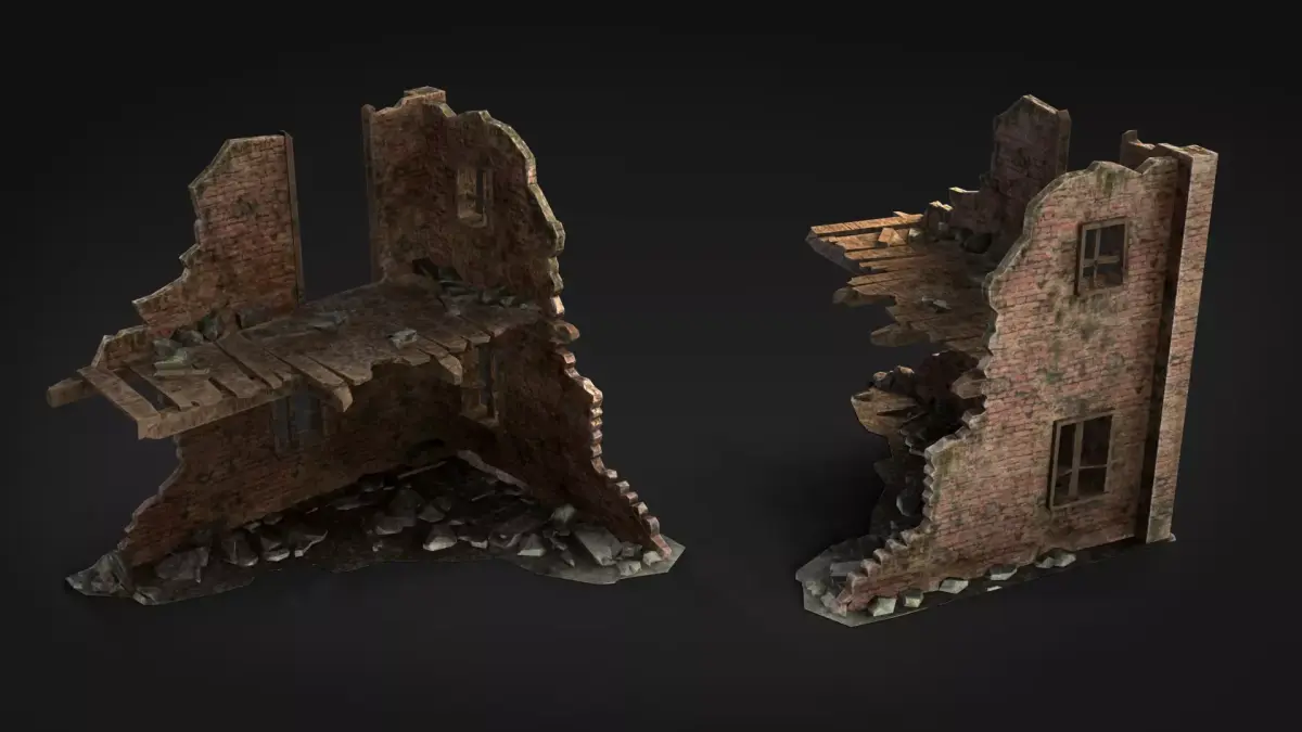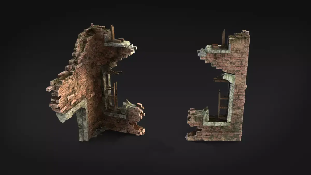 This pack includes 14 ruined brick and concrete wall assets designed for post-apocalyptic, abandoned, wartime or urban decay environments.The set contains large structural wall fragments, collapsed bases, and smaller rubble pieces for building detailed destroyed architecture.