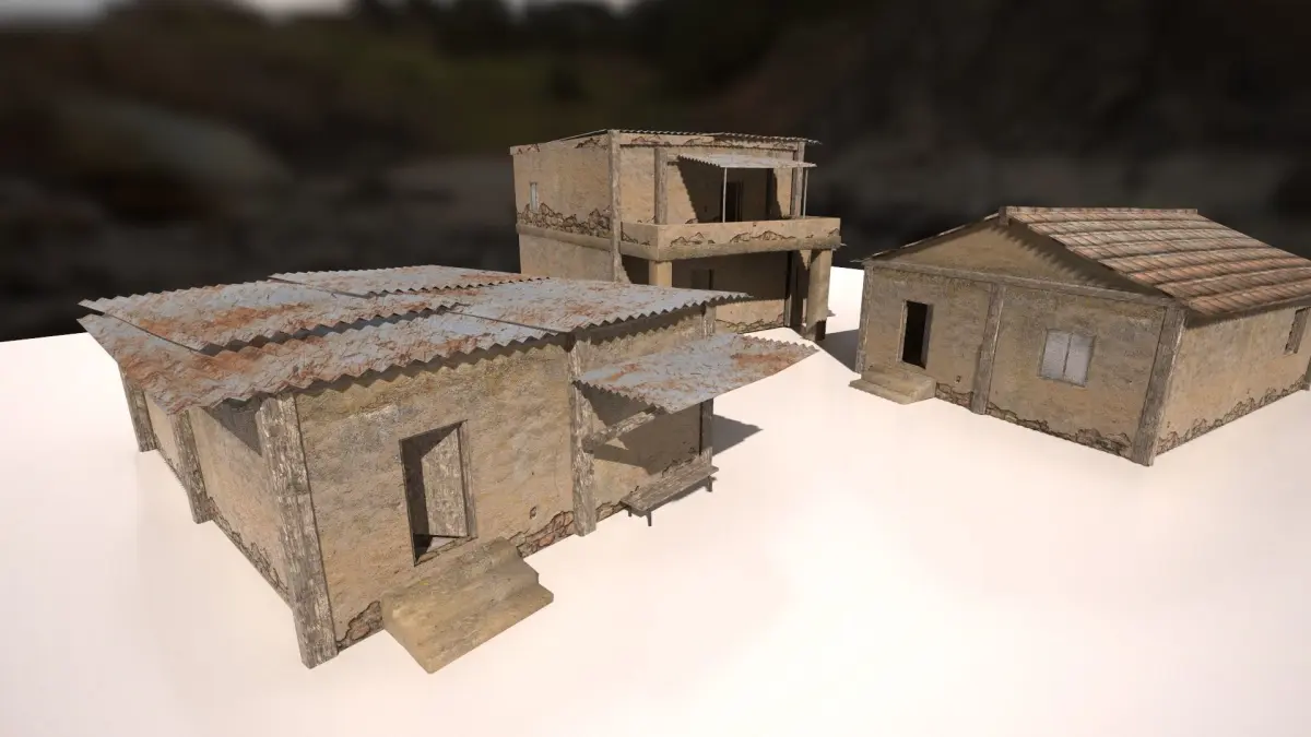 Three ruined buildings low poly, perfect for game / vr scenes /experiences.Models include exterior and interior parts.PBR Textures, size 2048x2048.This package includes 3 models:model A: 5624 trismodel B: 5528 trismodel C: 2800