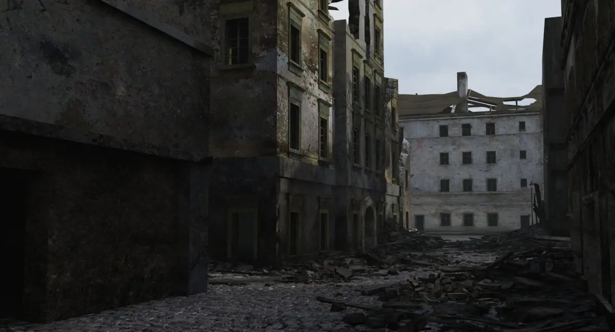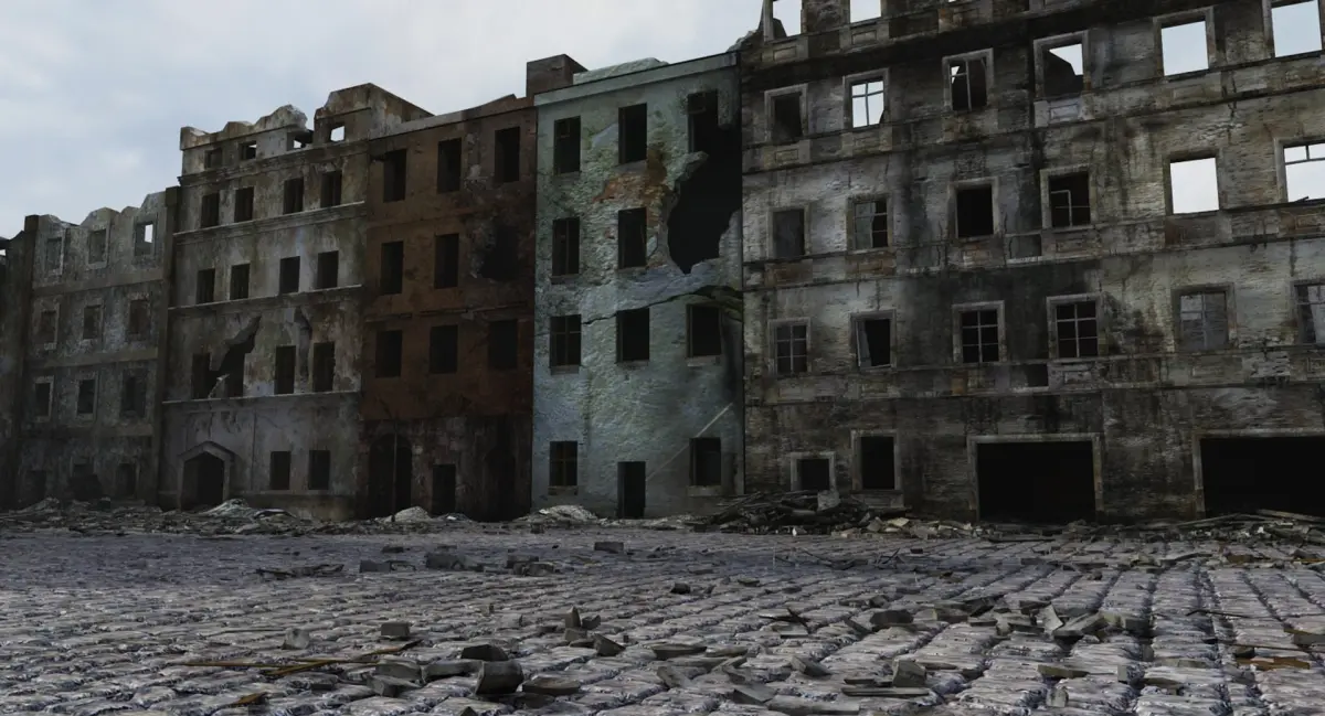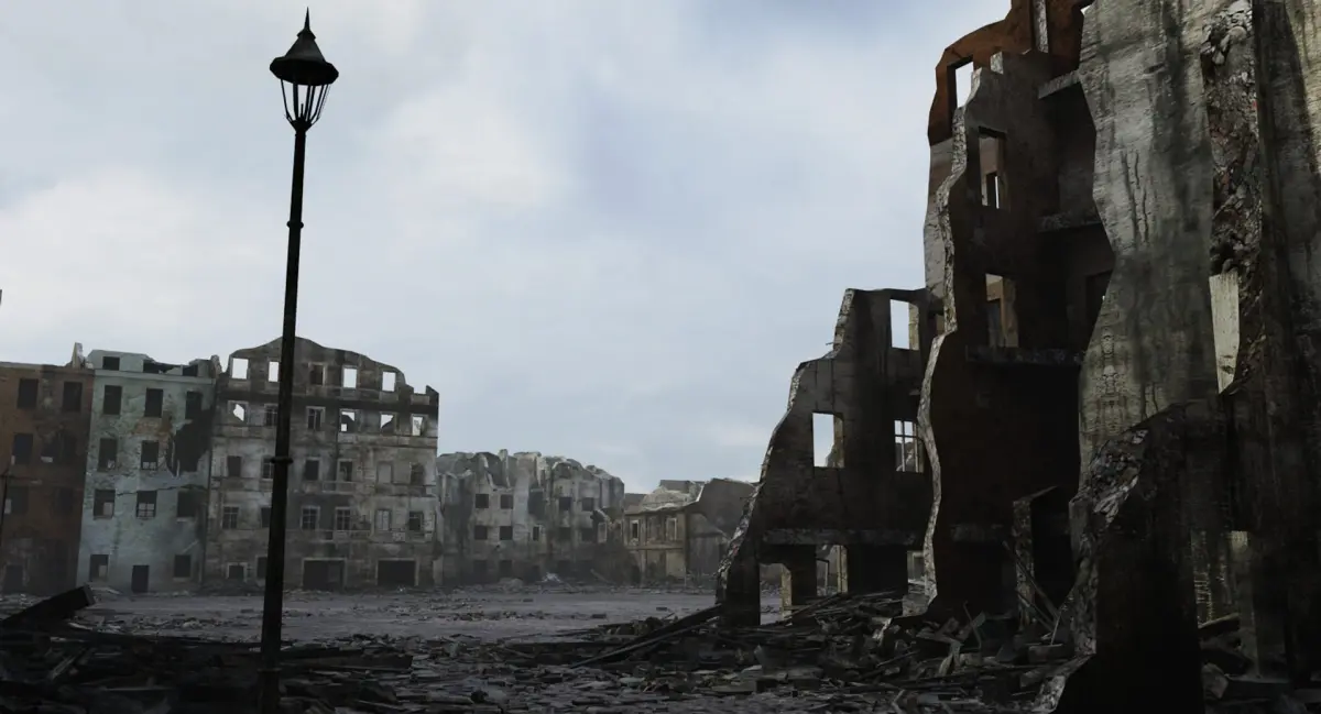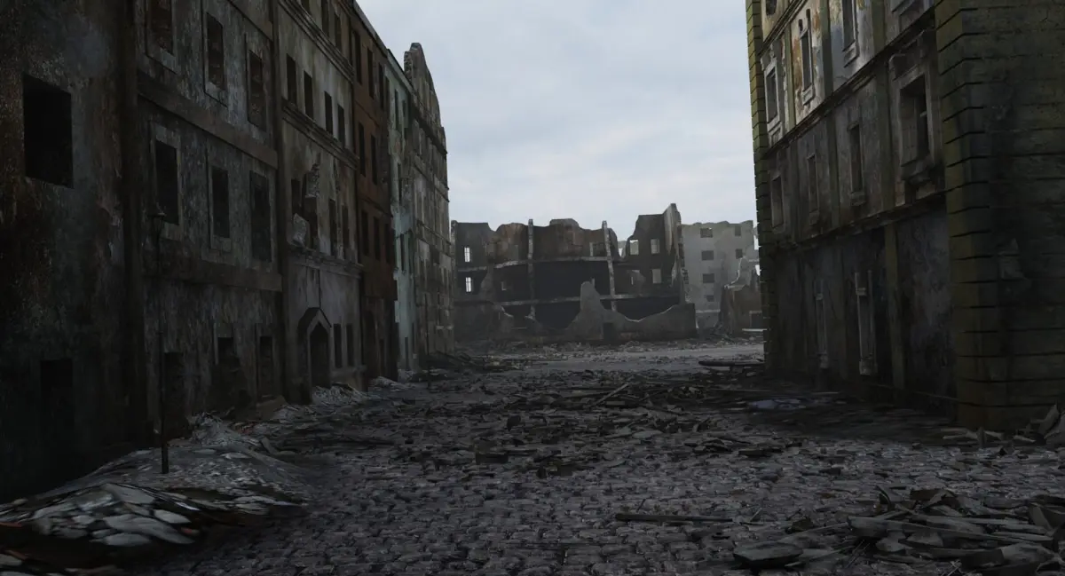 This is very accurate scene of destroyed city. Based on photos of ruined Warsaw (bombed and burned by German in 1939 and 1945).