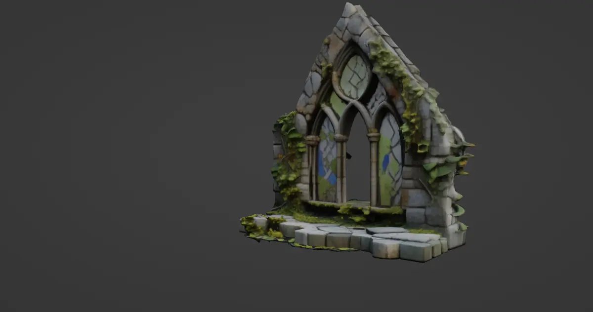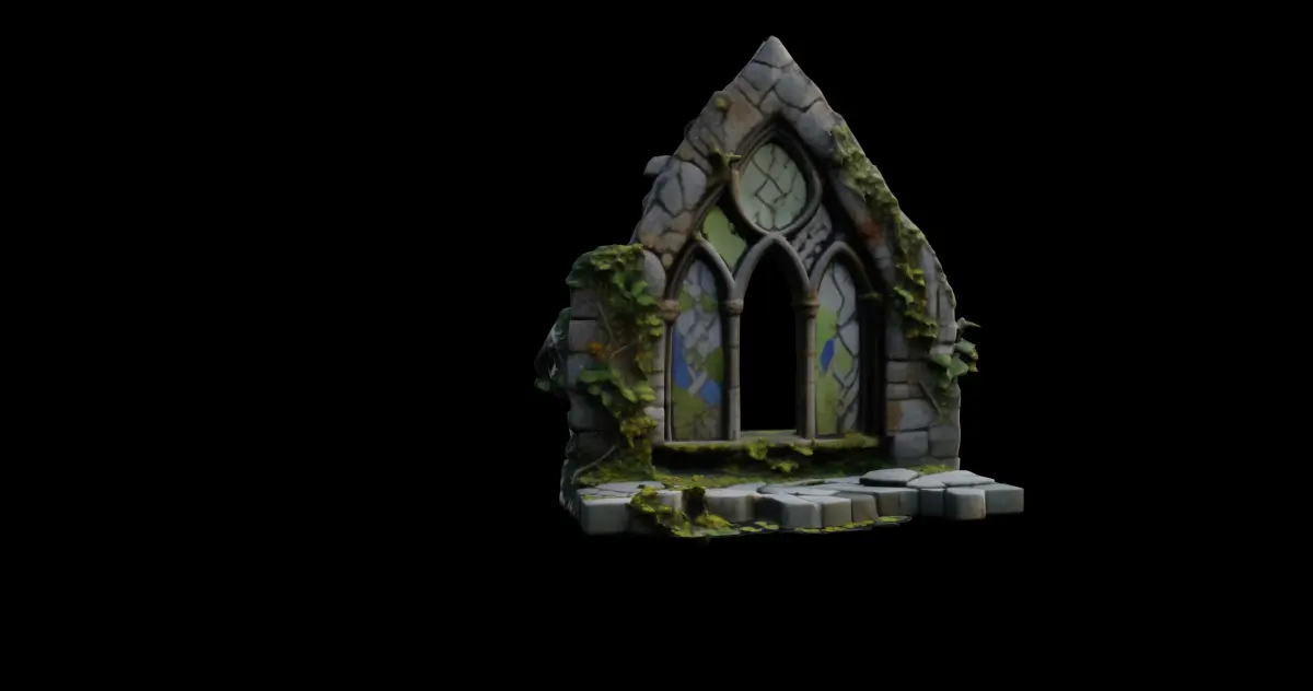 This intricately detailed 3D model captures the haunting beauty of a ruined Gothic cathedral window. The structure features three tall, arched openings supported by slender stone columns, characteristic of medieval Gothic architecture. Rich textures of cracked and weathered stone bricks give the structure a timeworn look, emphasizing its historical feel. The window is crowned with a pointed arch, lending a solemn, reverent atmosphere to the piece.Delicate stained glass inserts fill the window frames with soft, fragmented colors of green, blue, and violet, mimicking traditional glasswork while appearing aged and partially shattered. The glass panels are held in place by a lattice of lead that has also seen the effects of time, giving the whole composition an air of decay and mystique. This element makes the model especially evocative for scenes set in fantasy or post-apocalyptic worlds.Vines and overgrowth creep along the stones, curling around the pillars and sprawling over the ground at the base, reinforcing the impression that nature is reclaiming the remnants of the sacred space. The broken stone floor adds an extra touch of realism, with irregular, displaced tiles providing visual interest from every angle.This model is available for download in .gmb format, with textures included for seamless integration into your scenes. It is also available in .fbx format, making it compatible with a wide range of 3D software and engines.