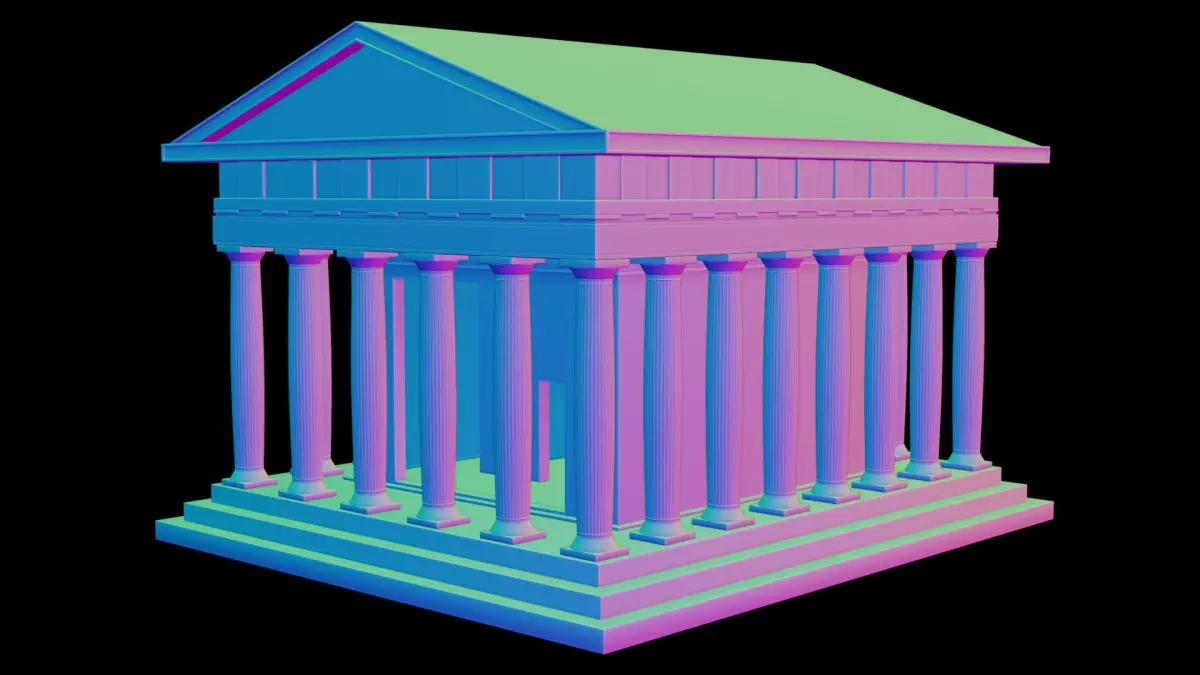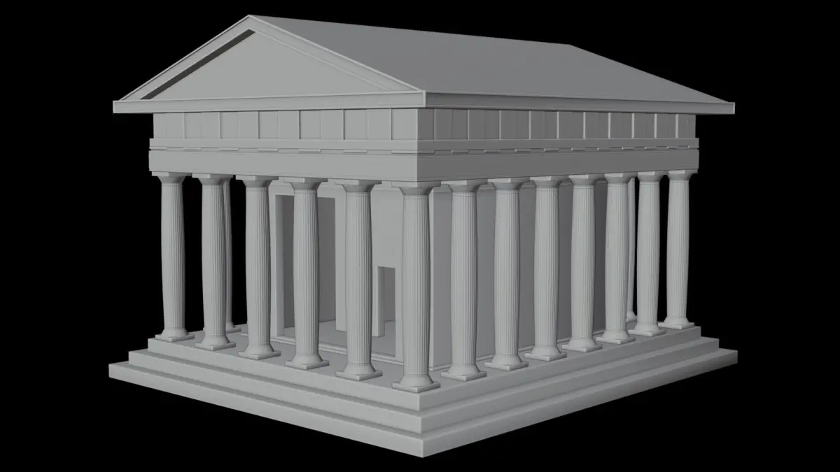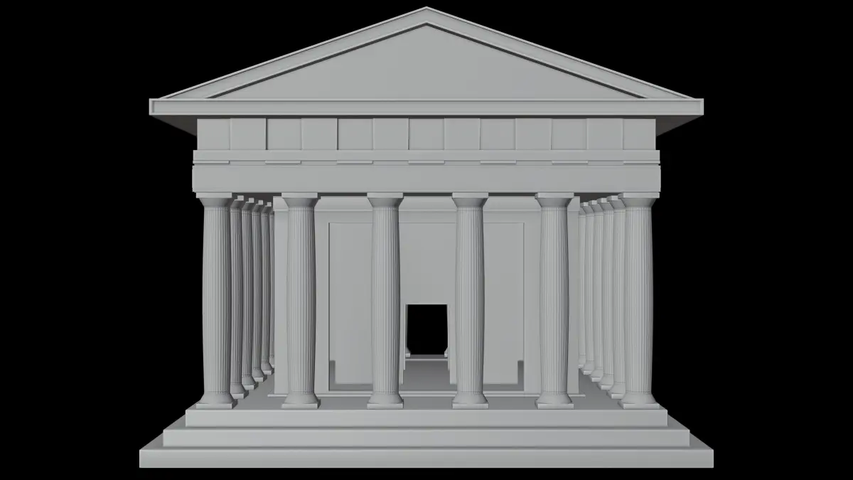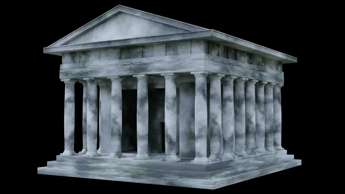 Ruined Greek Temple. With Doric Pillars, Greek Ornamental tilings, ceramic bricks, and stone tiles. Overgrown moss, cracks, and mold.