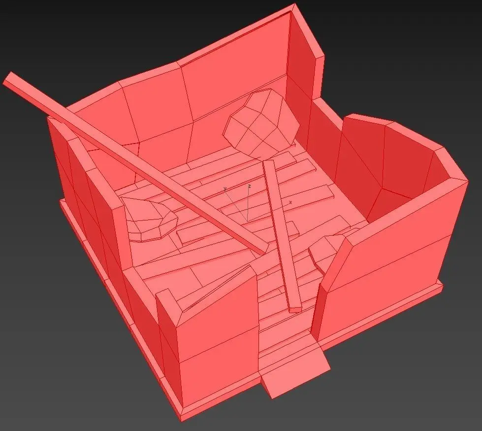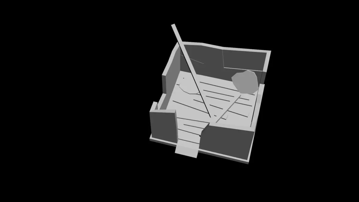 Ruined house floor which contains a few planks as a basis floor, 2 support beams, 4 fragments of btoken concrete. There are 2 window openings and 1 door .
