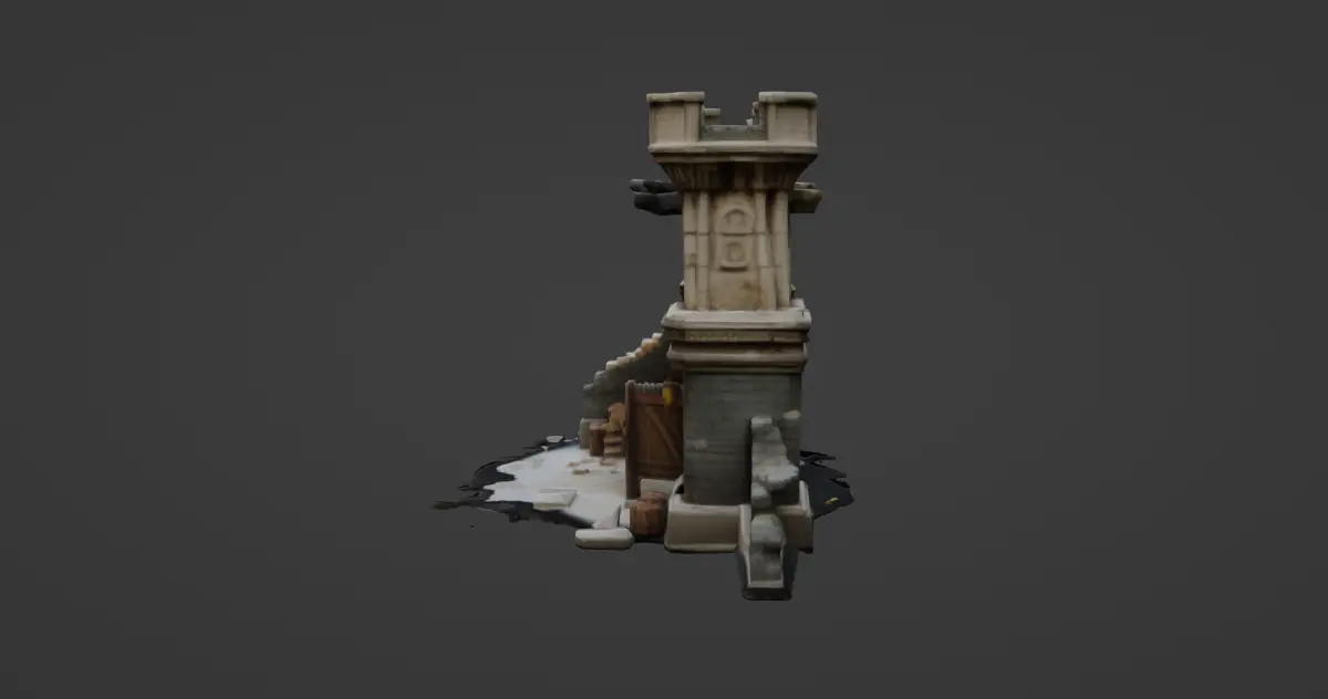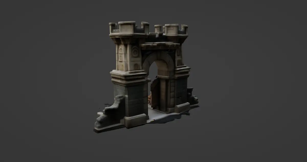 This detailed 3D model represents a ruined medieval gatehouse, capturing the weathered majesty of a once-imposing stone structure. The gatehouse features two cylindrical towers flanking a central arched passageway, partially collapsed yet still standing proudly. Chiseled stone blocks and intricate medieval carvings highlight the craftsmanship of a bygone era, while the aged wood of the broken gate hints at long-forgotten battles and the relentless passage of time.The structure's facade is richly textured, with cracks, mossy patches, and scattered debris adding to its sense of decay and realism. The left tower has collapsed stonework, with fallen bricks and timber leaning casually against the wall, suggesting recent structural failure or the remnants of past conflict. The right tower is more intact, lit by a medieval-style lantern, lending the scene a touch of narrative ambiance.Perfect for use in fantasy or historical game environments, this model fits seamlessly into medieval towns, ruined fortresses, or RPG battle maps. The attention to environmental storytelling makes it ideal for cinematics, VR experiences, or tabletop simulations, offering a visually immersive setting full of character and history.The model is downloadable in .gmb format, and includes high-resolution texture files. It is also available in .fbx format for broader compatibility across 3D applications and game engines.