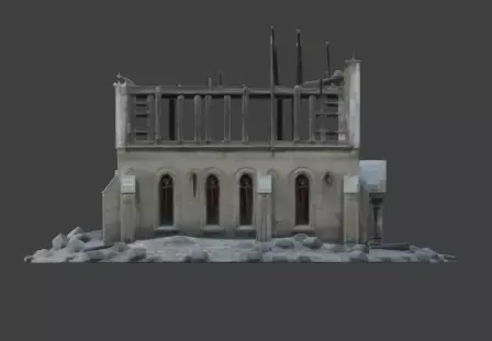 This is a high quality 3D model of a ruined stone church or chapel. The model features realistic weathered stone textures, arched windows, and a partially collapsed gabled roof with exposed wooden structural beams. Detailed piles of rubble and broken masonry surround the base of the building, making it a perfect asset for post-apocalyptic, historical, or fantasy environment designs. The structure is professionally rendered to provide a high level of visual detail for cinematic scenes or game environments.