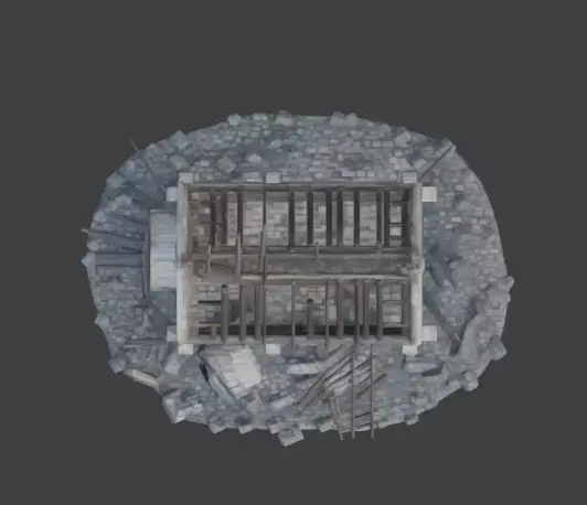 Complex ruined roof structure with realistic exposed wooden beams