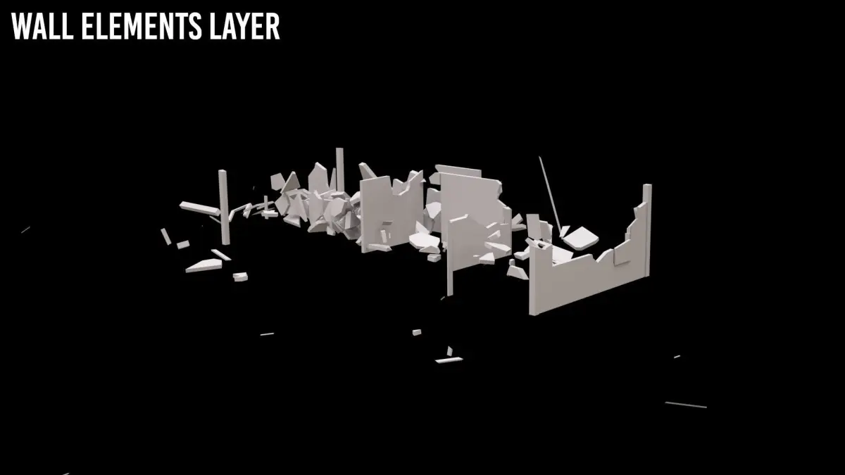 A destroyed high poly villa model with 6 different layers (glass, roof, stairs, wall, wall elements, wall planks).