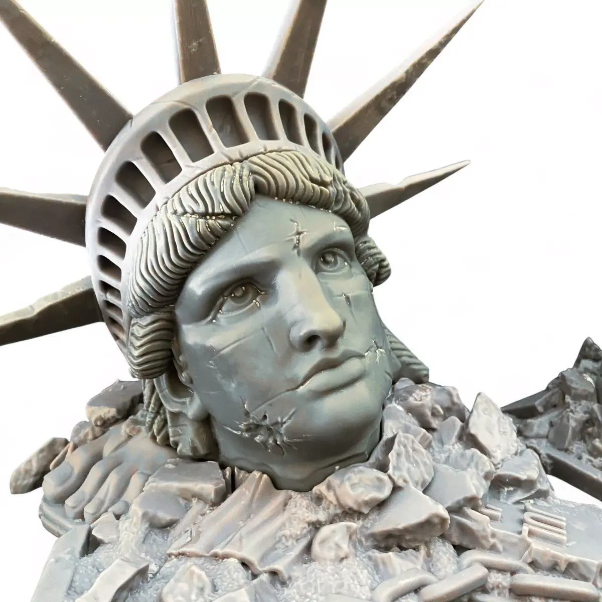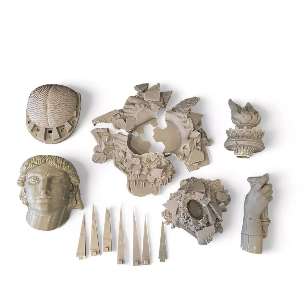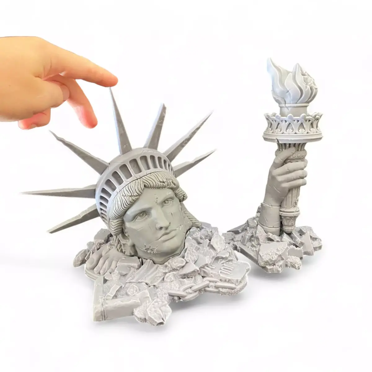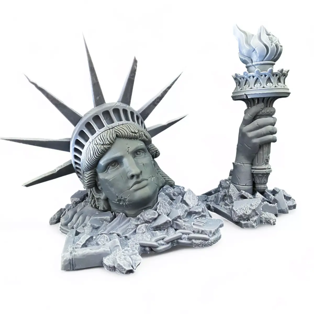 Ruins of Liberty - a haunting symbol of a fallen civilization and the price of progress.The set includes separate parts of the shattered statue: the head, crown, torch, and rubble bases.