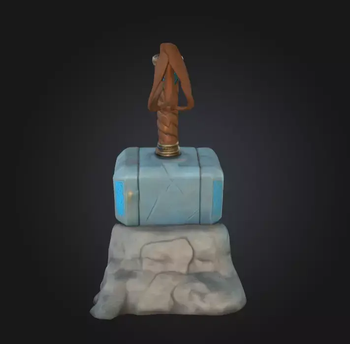 The stone pedestal beneath the hammer completes the narrative. Runic inscriptions glow faintly, reinforcing the aura of an enchanted relic that only the chosen can wield. The base is rugged and weathered, showing chips and erosion from time, which further emphasizes the artifact’s long-standing history and sacred status.