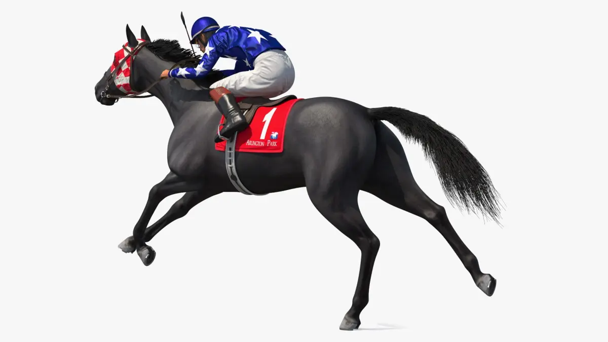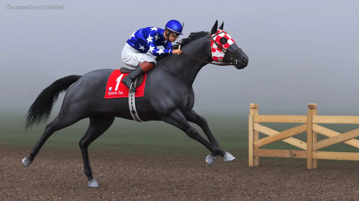 Running Black Racing Horse with Jokey is a 3d model of a horse and jockey in a racing pose, showcasing the dynamic and thrilling sport of horse racing.