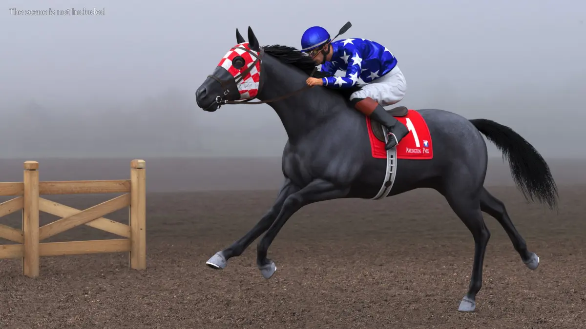 Running Black Racing Horse with Jokey is a high quality, photo real 3d model that will enhance detail and realism to any of your rendering projects. The model has a fully textured, detailed design that allows for close-up renders, and was originally modeled in 3ds Max 2020 and rendered with V-Ray. Renders have no postprocessing! Assets in the scene are highly detailed and can be used standalone in any of your projects.