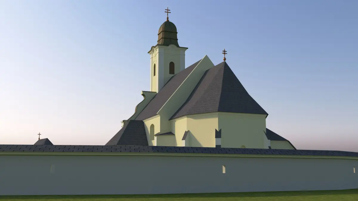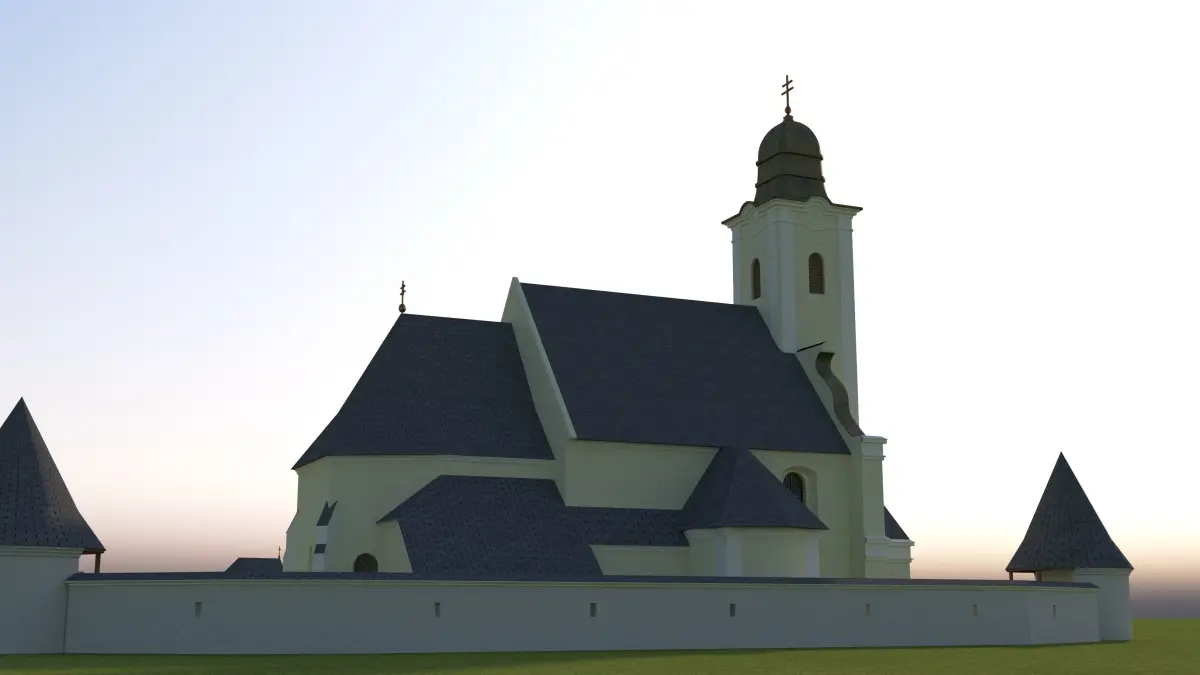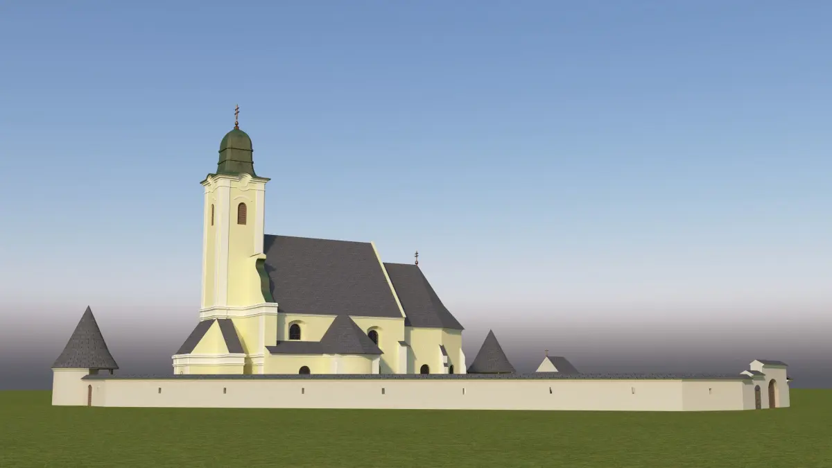 The model includes the exterior of the baroque church building (no interiors) with fence and two towers, a small burial chapel (no interiors), cemetery with tombstones, doors, windows.