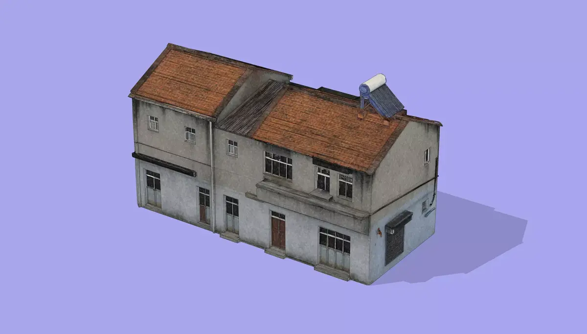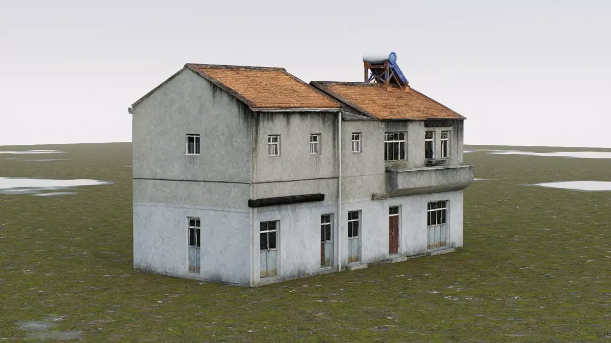 This 3D low-poly model depicts a typical rural self-built house commonly found in countryside areas of China. Featuring a two-story structure with a weathered concrete exterior, tiled roof, and multiple windows, the model captures the modest architectural style and functional design characteristic of such homes. A solar water heater mounted on the roof reflects modern utility integration into traditional rural living. The model is ideal for use in simulations, games, or architectural visualization projects requiring realistic yet optimized rural residential buildings.
