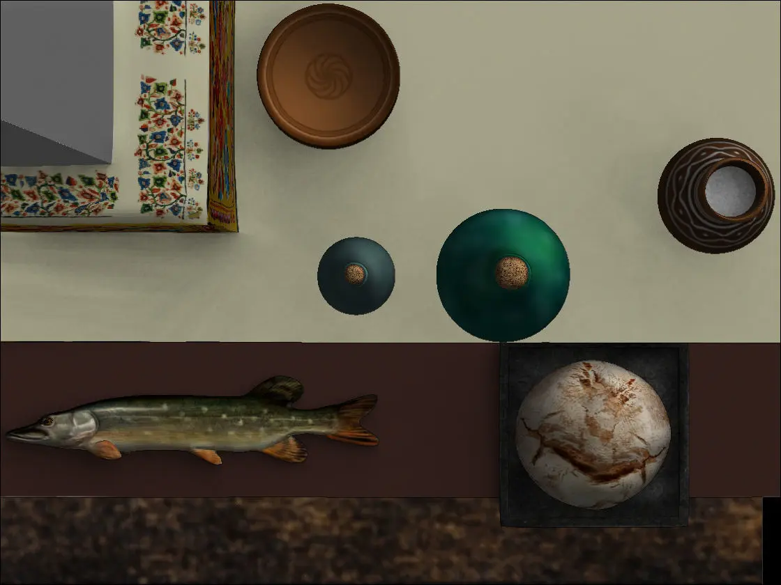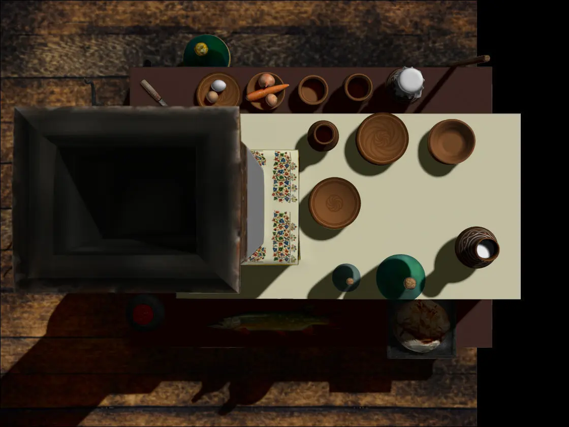 The asset includes: Oven, firewood, poker, wooden shovel, pies, dechka, earthenware, wooden spoons, glass bottles with wine and vodka, jug of milk, bread, knife, pike, onion, carrot, clay plates, cauldron with borscht, wooden floor.