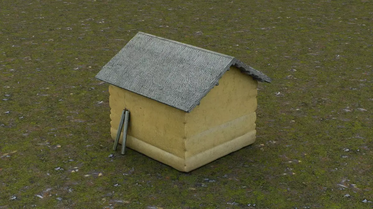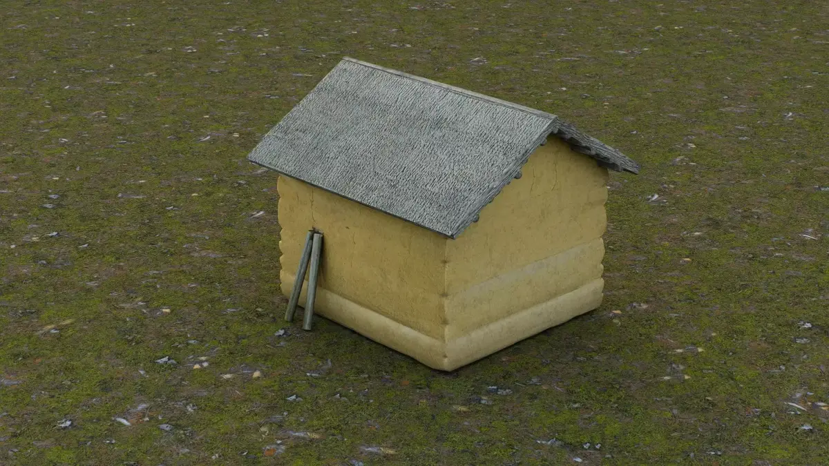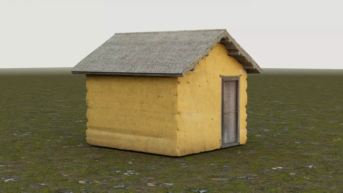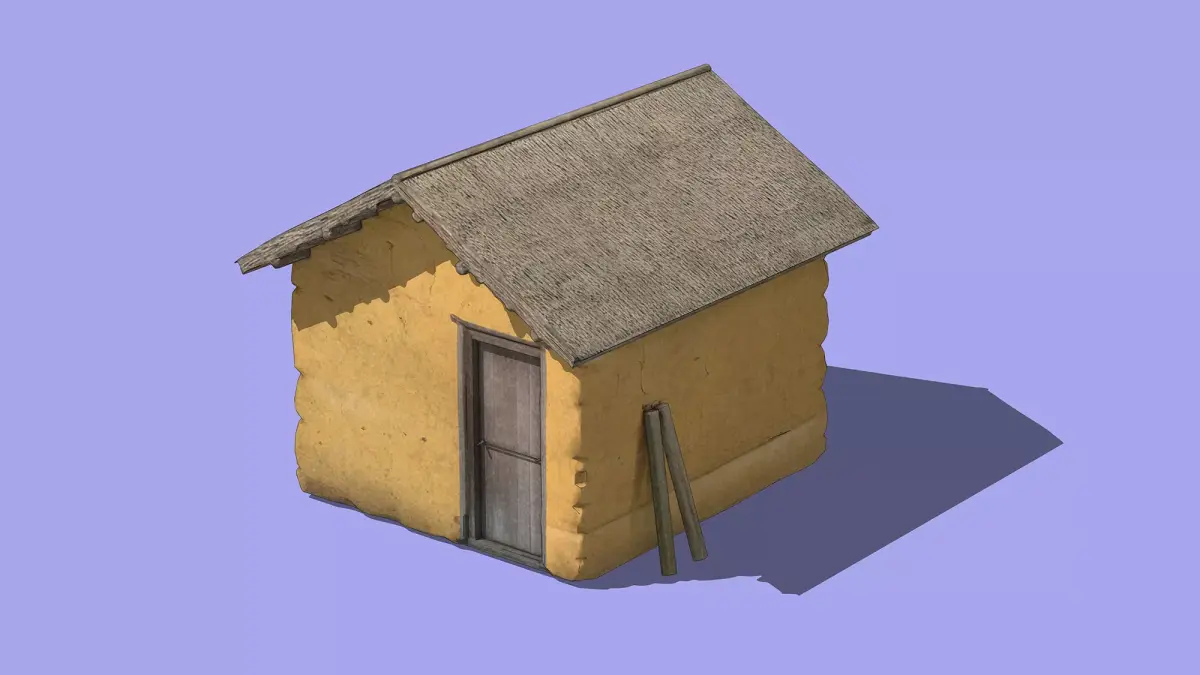 This 3D low-poly model depicts a rustic rural warehouse, designed with a simple yet functional structure typical of traditional countryside storage buildings. Constructed from textured yellow adobe or mud-brick walls and topped with a weathered thatched roof, the shed features a single wooden door and minimal detailing, emphasizing practicality over ornamentation. A pair of leaning wooden planks adds to its aged, utilitarian appearance. Ideal for use in historical simulations, farming environments, or game asset libraries, this model captures the essence of modest agricultural storage architecture.