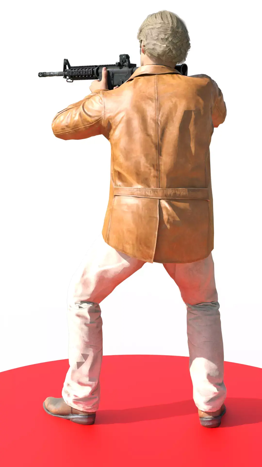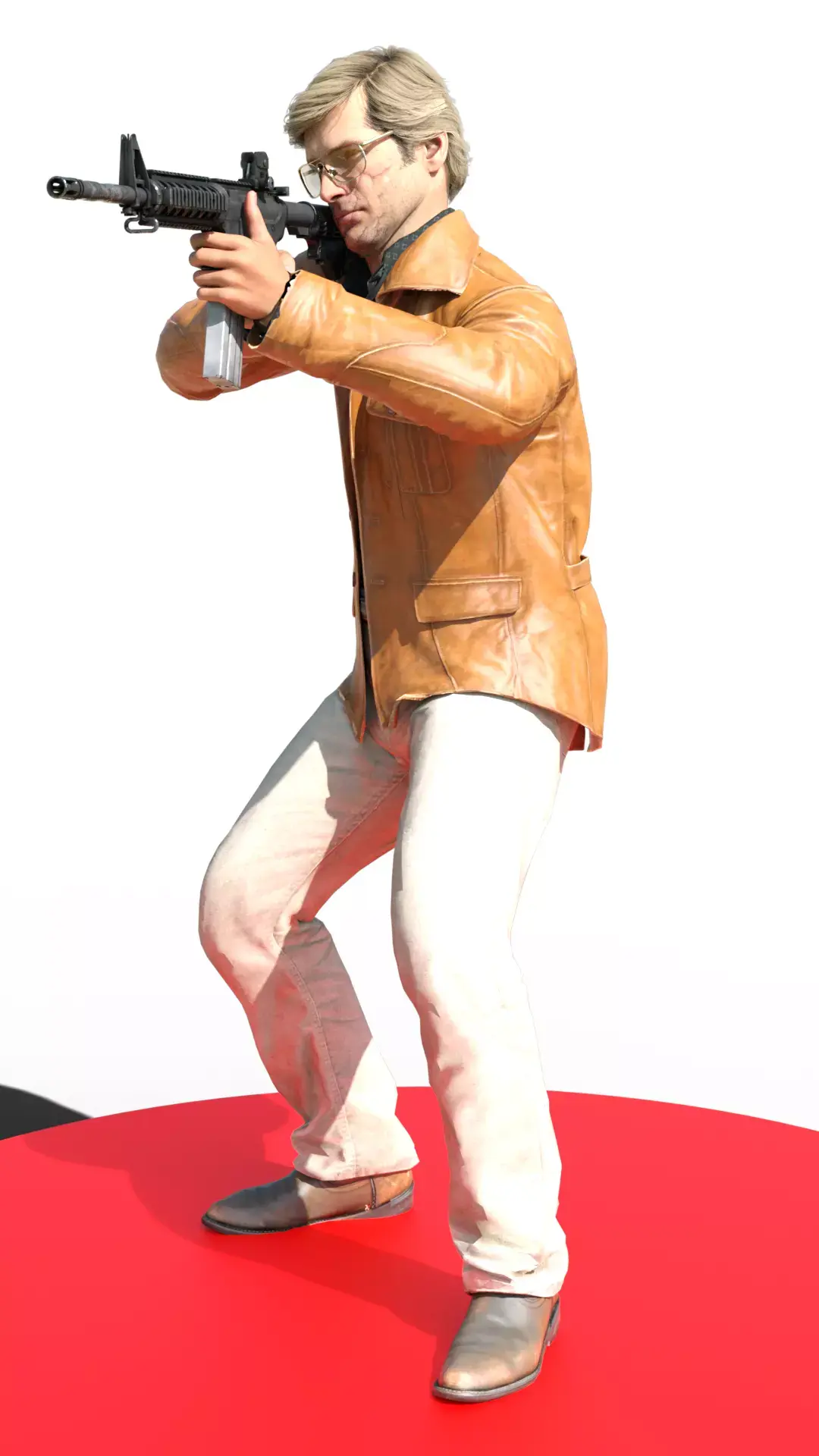 Adler is dressed in an iconic Cold War-era outfit: a caramel or light brown leather jacket, a dark shirt underneath, cream or off-white trousers, and leather dress shoes. The texture of the leather jacket is particularly realistic, showing folds and shine. He holds the rifle with both hands, maintaining a tense, ready-to-fire posture. The character stands on a bright red circular platform, with a black background that isolates him and emphasizes the action.
