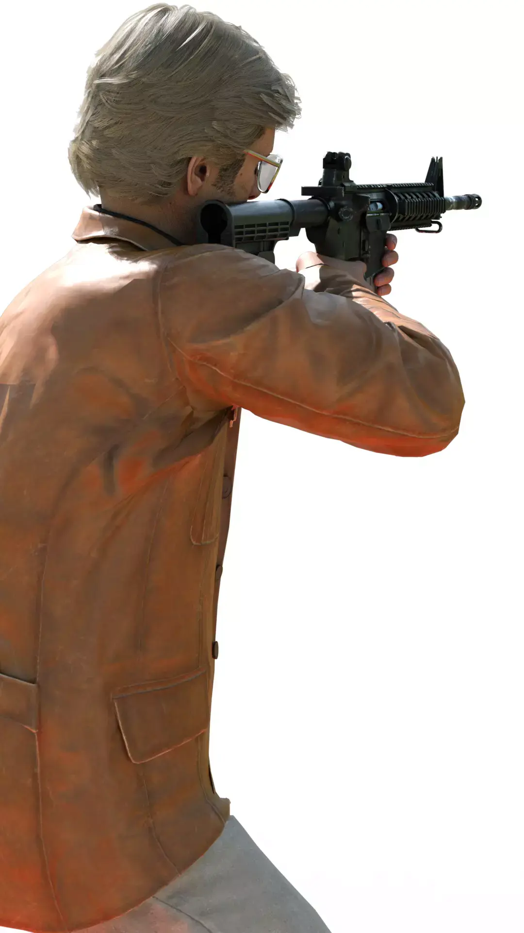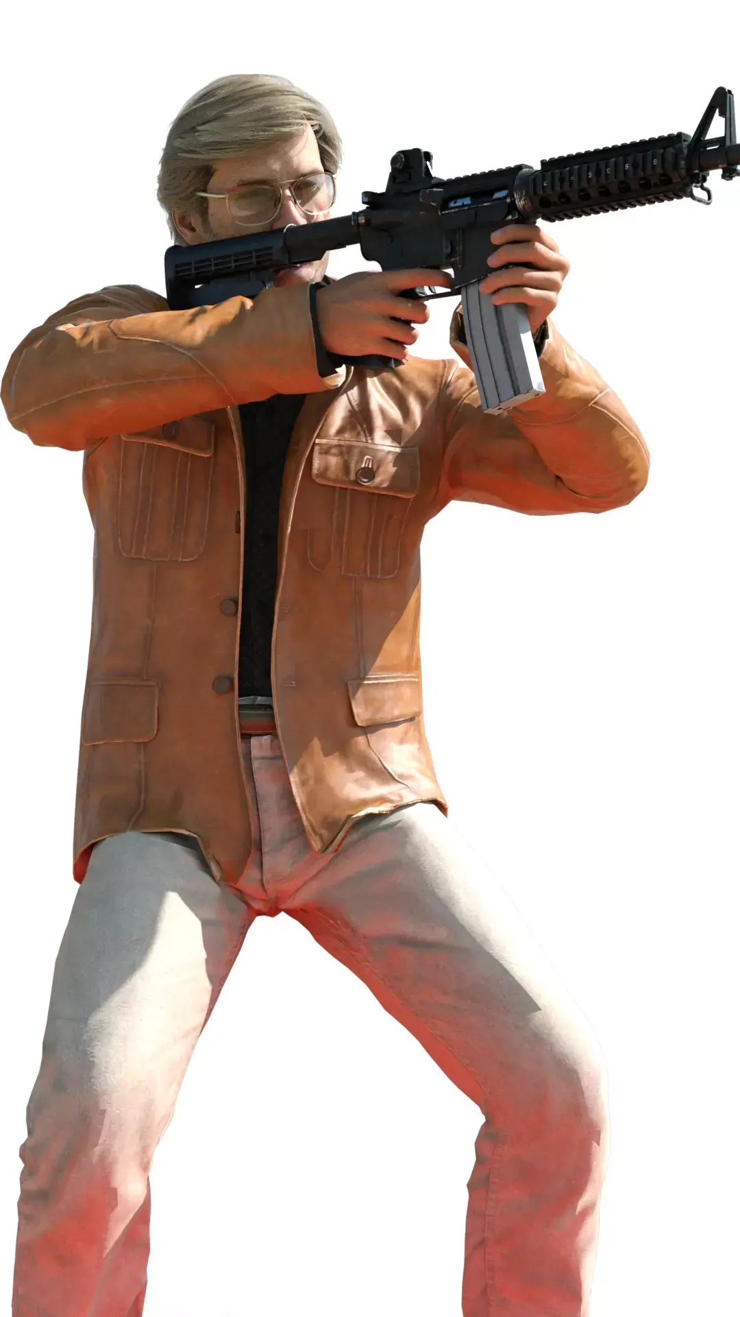 A full-body 3D render featuring Russell Adler in a combat stance, aiming an M16 assault rifle. The model has a robust and detailed appearance, with his characteristic combed-back blonde hair and aviator glasses (though here they are worn as regular glasses).