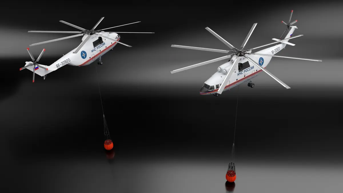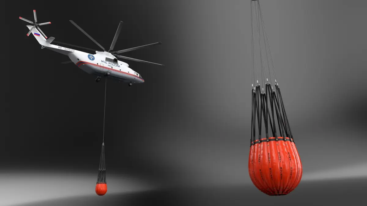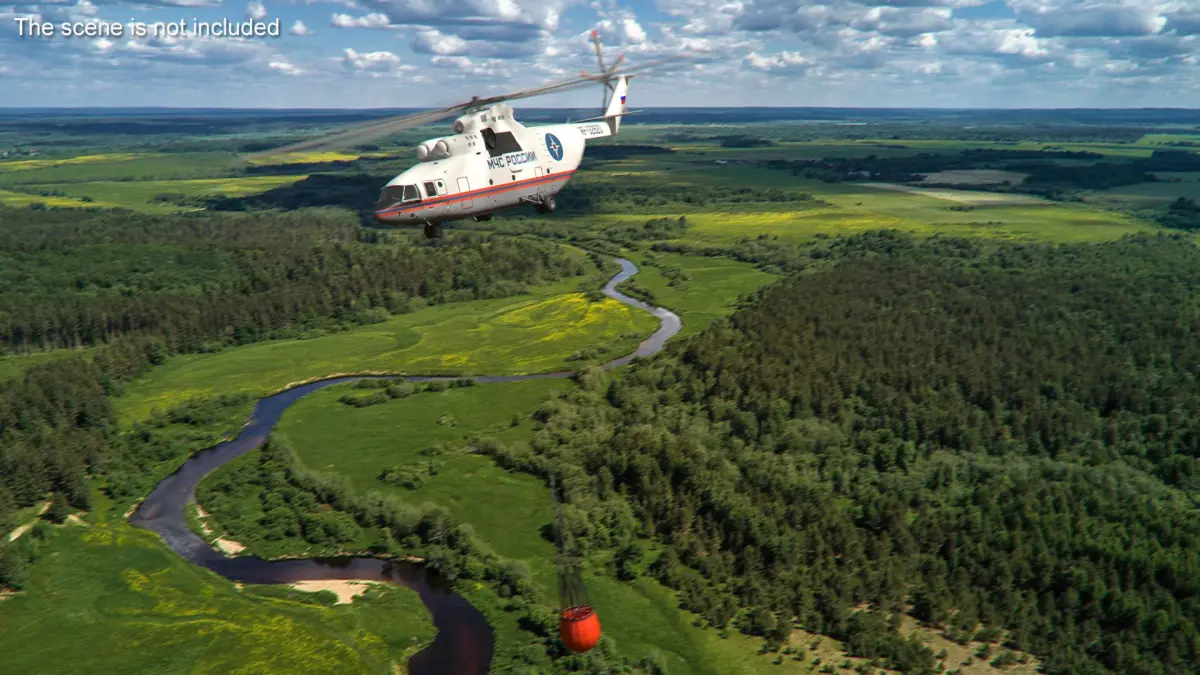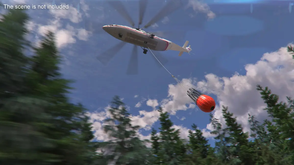 Russian EMERCOM Helicopter Mi-26 with Bambi Bucket Rigged is a 3d model of a helicopter equipped with a Bambi Bucket, a specialized system designed for aerial firefighting operations.