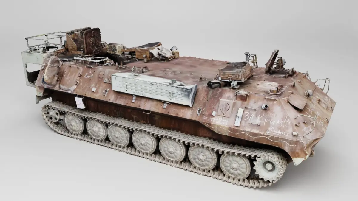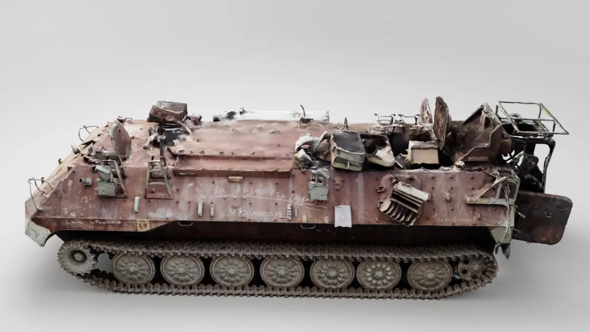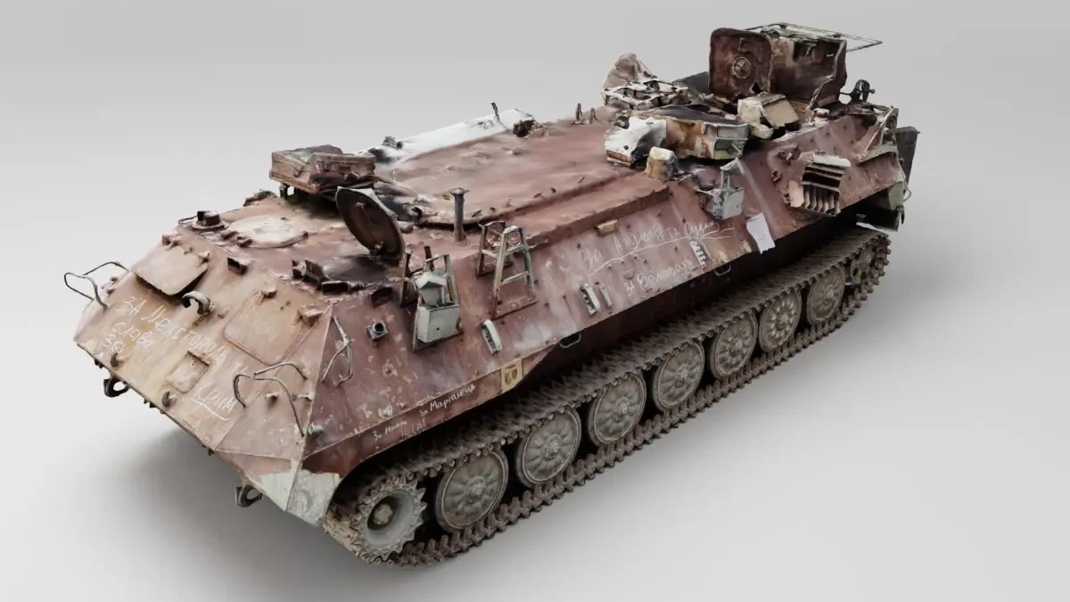 russian MT-LB literally multi-purpose towing vehicle destroyed by Ukrainian military during russian occupation of Ukraine, 2022 war in Ukraine. Please support Ukrainian artists