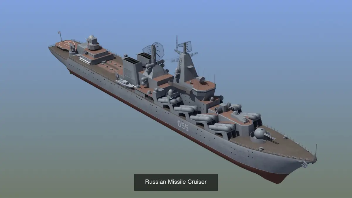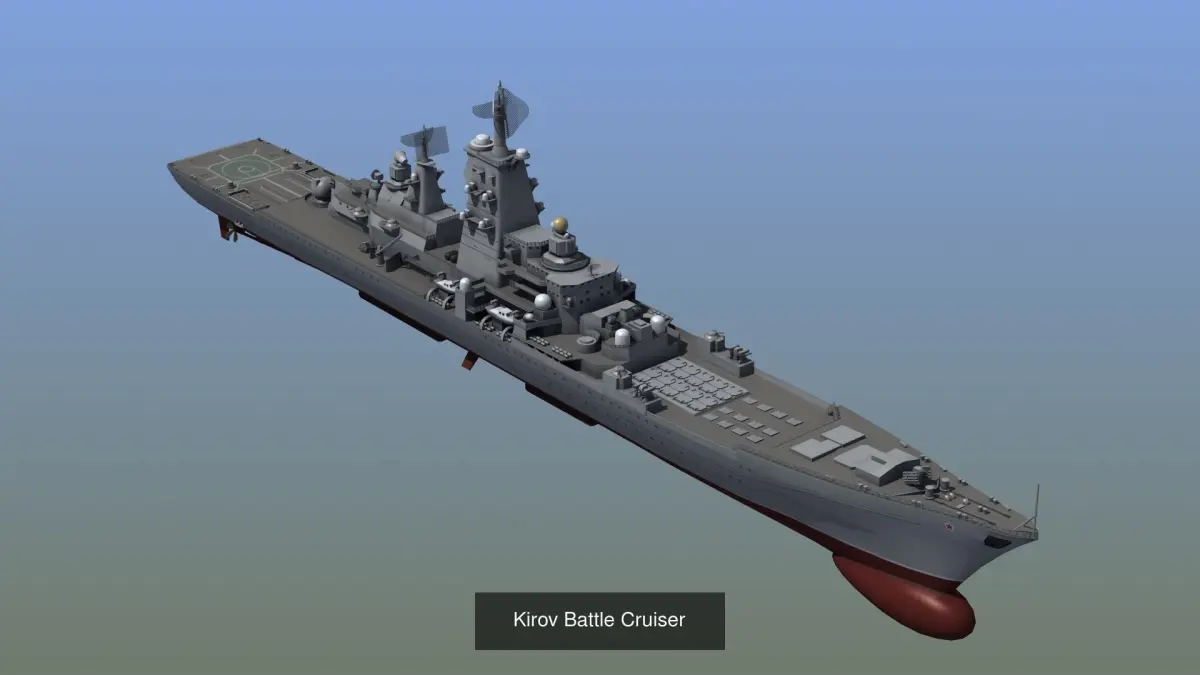 Russian Navy Set 02, collection of 4 warships of the Russian naval forces. Typhoon class submarine, Kirov class battle cruiser, Slava class destroyer and BuyanM missile corvette.