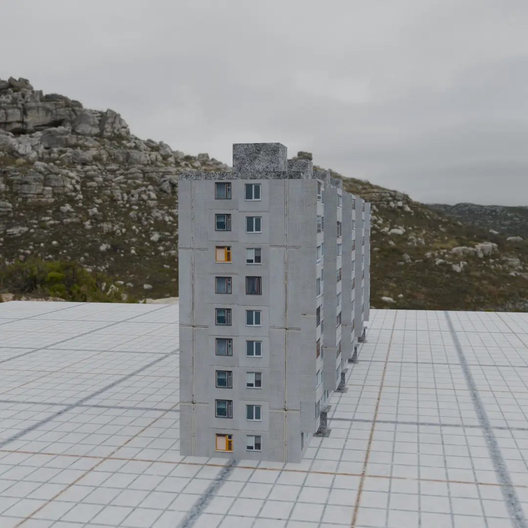 Front:Realistic texture of concrete panels with a variety of windows and balconies. Photo textures with elements of dirt, wear and typical coloring of window frames and doors (different shades, insulated balconies, curtains, etc.) are used.Materials and textures:The main material is concrete.Visual details: rust, streaks, darkening, moldy areas, which adds realism.