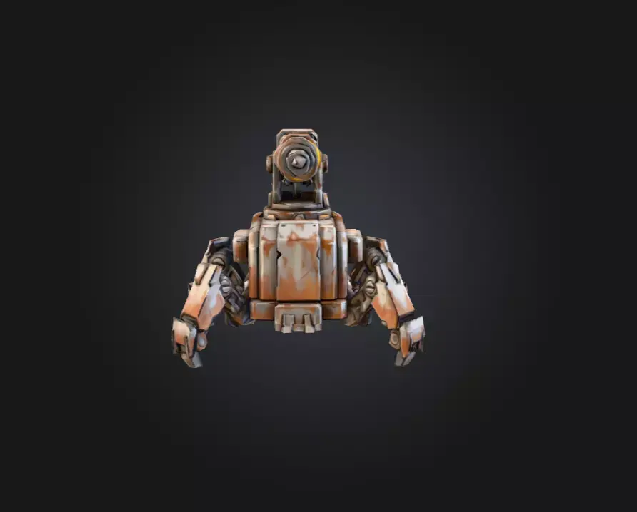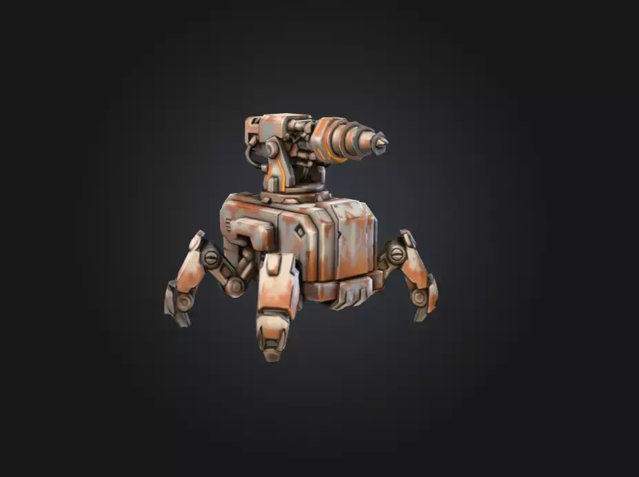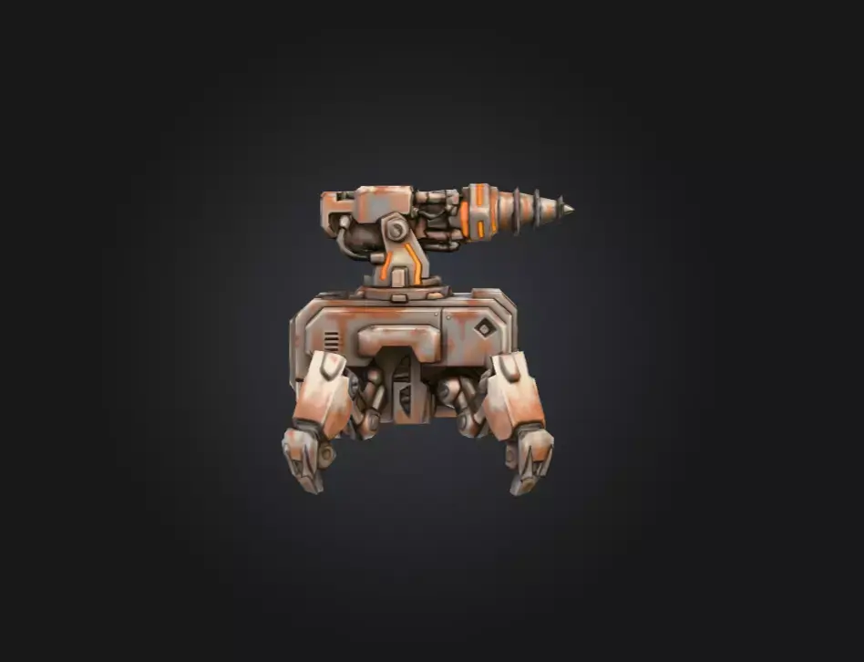 The Rustborn Auto-Drill Turret is a rugged, industrial-grade mechanical unit engineered for both excavation and defensive applications in hazardous, resource-rich environments. Designed with a compact but heavily reinforced body, the turret stands on four multi-jointed legs that provide exceptional balance and mobility across uneven terrain, rocky outcrops, abandoned factories, and sci-fi mining colonies. Every limb features detailed mechanical plating and robust connectors, emphasizing a blend of industrial durability and futuristic robotics.