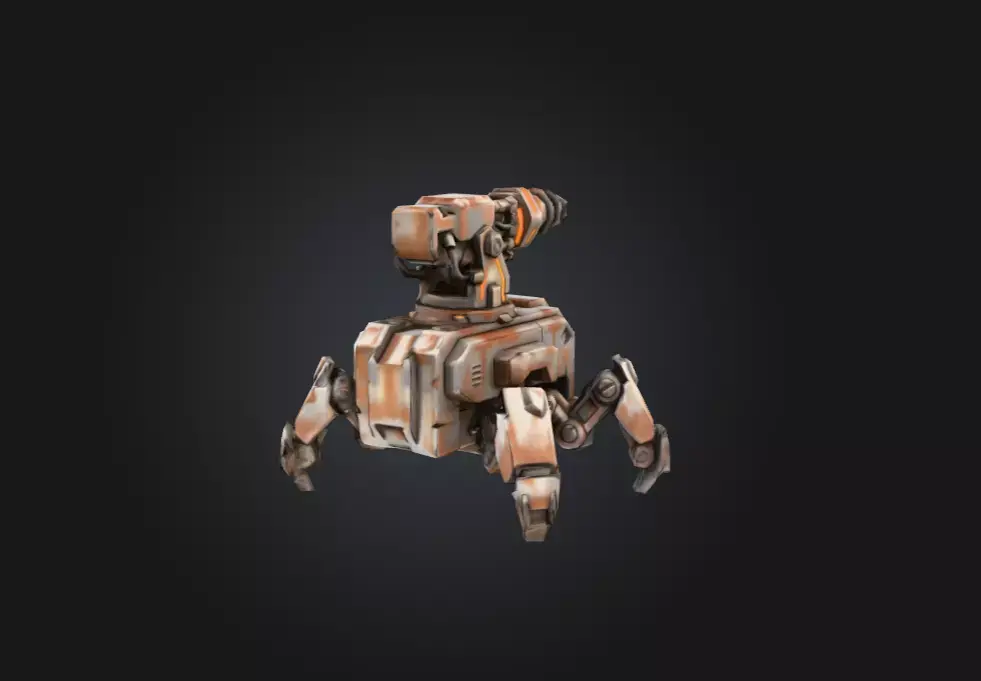 Underneath, the legs articulate with insect-like precision, enabling the turret to reposition, stabilize, or anchor itself before drilling or firing. The design reflects a balance of utility and menace, making it suitable for sci-fi games, RTS titles, tower-defense setups, dystopian environments, mining colonies, robotic swarms, or environmental props in post-apocalyptic scenes.