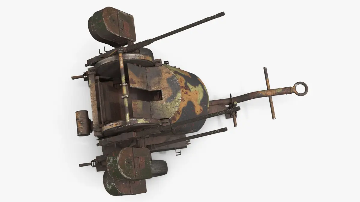 Rusted Abandoned WWII Quad Mounted Anti-Aircraft Gun is a 3d model of a vintage anti-aircraft artillery piece, showcasing intricate mechanical components and a weathered appearance.