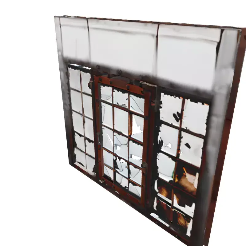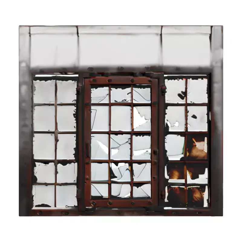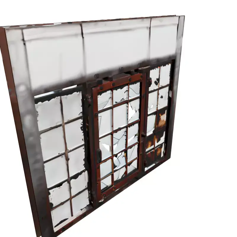 This highly detailed 3D model presents a formidable rusted industrial window frame, meticulously crafted to depict advanced stages of decay and abandonment. The heavy-duty metal frame is riddled with authentic-looking rust, corrosion, and wear, featuring robust rivets and a strong, utilitarian design characteristic of old factories or derelict buildings. A central window panel is hinged, though visibly weathered, while the surrounding fixed panels show significant degradation. The glass panes are a mix of completely missing sections, shattered fragments, and some even exhibiting burn marks, adding to its derelict character. This asset is ideal for creating immersive and gritty environments, perfect for post-apocalyptic settings, horror games, urban decay scenes, or historical industrial visualizations. It can serve as a focal point or background element in game development, architectural renders of abandoned structures, AR/VR experiences, or digital art compositions. The model is optimized for efficient real-time rendering, ensuring smooth performance in interactive applications, yet boasts sufficient detail for high-quality static renders. It is provided with clean topology, is fully UV unwrapped, and includes high-resolution PBR textures to deliver realistic material properties across various rendering engines. Supported file formats include GLB, OBJ, FBX, STL, ABC, DAE, USD, and PLY, making it versatile for any professional pipeline.