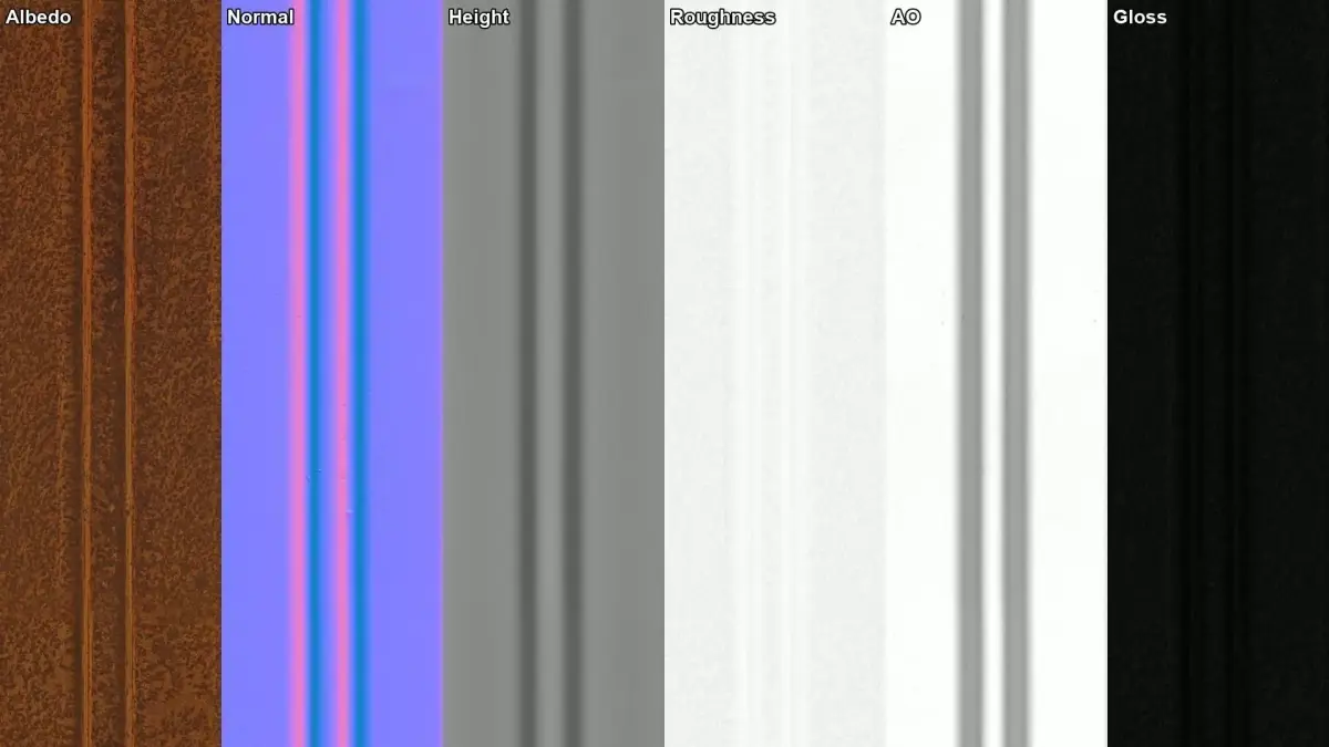 Maps - Albedo (lighting removed), AO, Glossiness, Roughness, Height, Normals